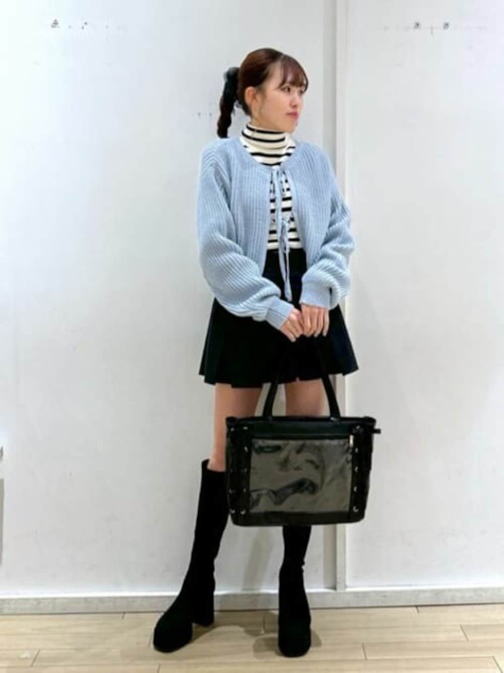 今回はガーリーコーデにしました! ロングブーツは店舗でも大人気のアイテムで、おすすめのブーツです! ふくらはぎに当たる部分の生地が柔らかいので履き心地も抜群です! 程よくヒールもあるので脚を長く綺麗に見せてくれる便利アイテムです👌🏼 痛バはこの大きさがめっちゃ使いやすいかなって思います!A4ファイルも入るサイズ感で大容量です! レースアップのリボンも超可愛くておすすめです!特にブラックはライブ以外でも普段使いしやすい所もおすすめポイントです◎
