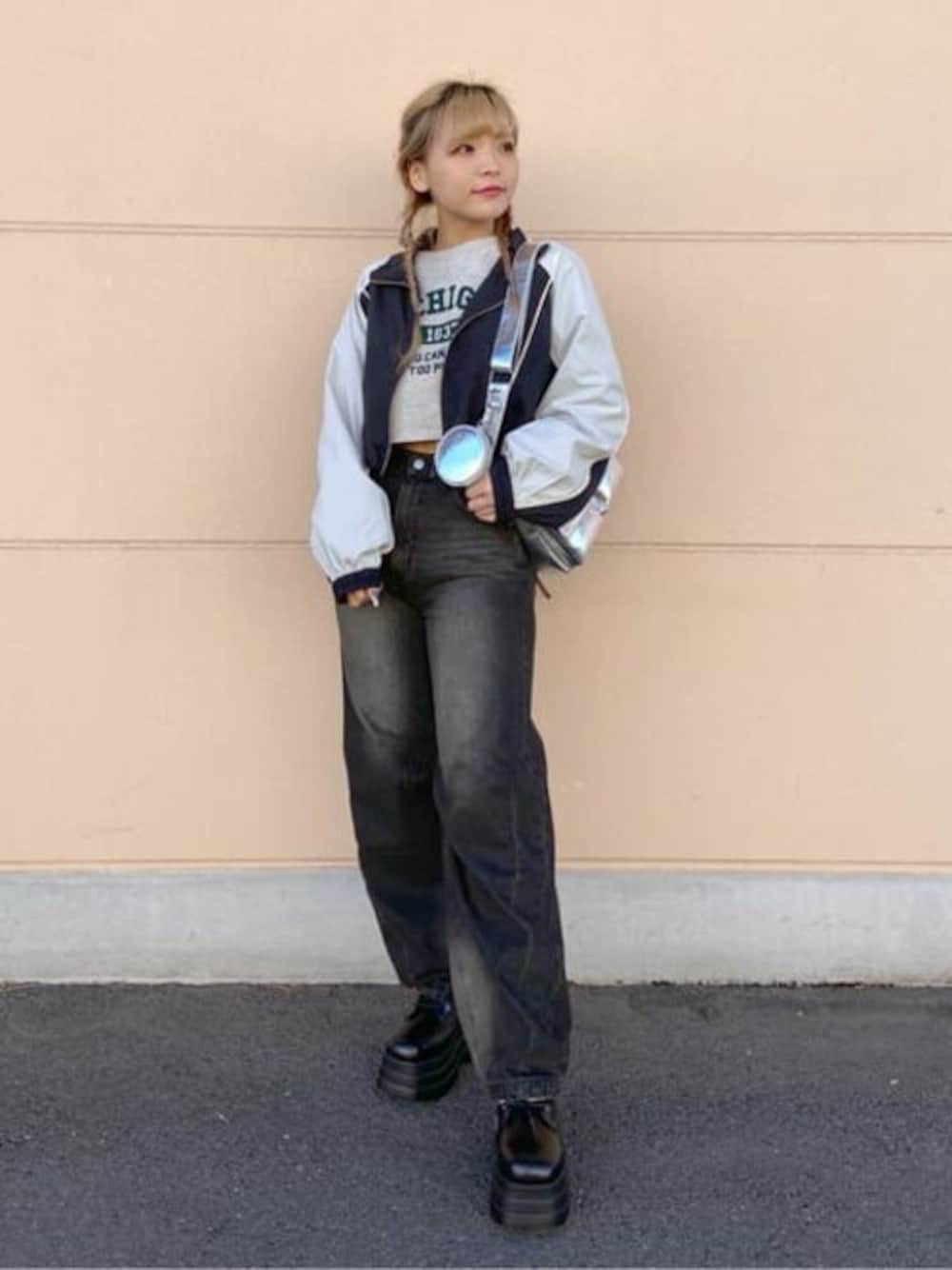 ナイロントラックブルゾンを使ったストリートコーデ! 薄手のナイロン素材になっていて、裾にドローコードが付いているのでお好きなシルエットに変えて着用できます! スポーティなコーデが好きな方にはもちろん、 フリルのロングスカートと合わせても今風で可愛いのでオススメです!!