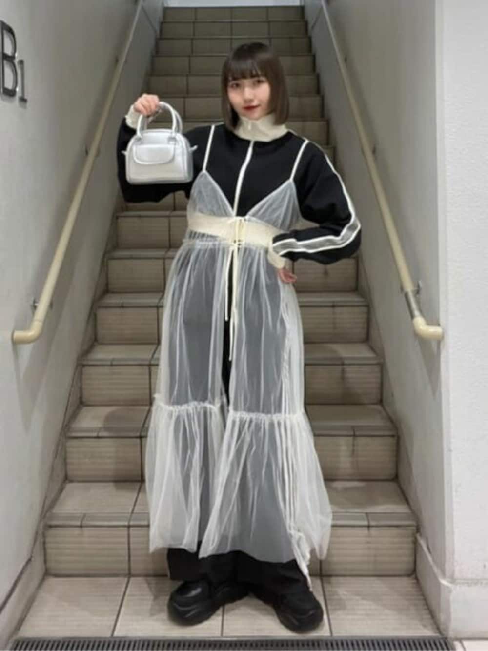 トラックジャケットとトラックパンツにシアーのワンピースを合わせた春先取りコーデ♪ モノトーンカラーでまとめると、シンプルながらおしゃれな印象に!