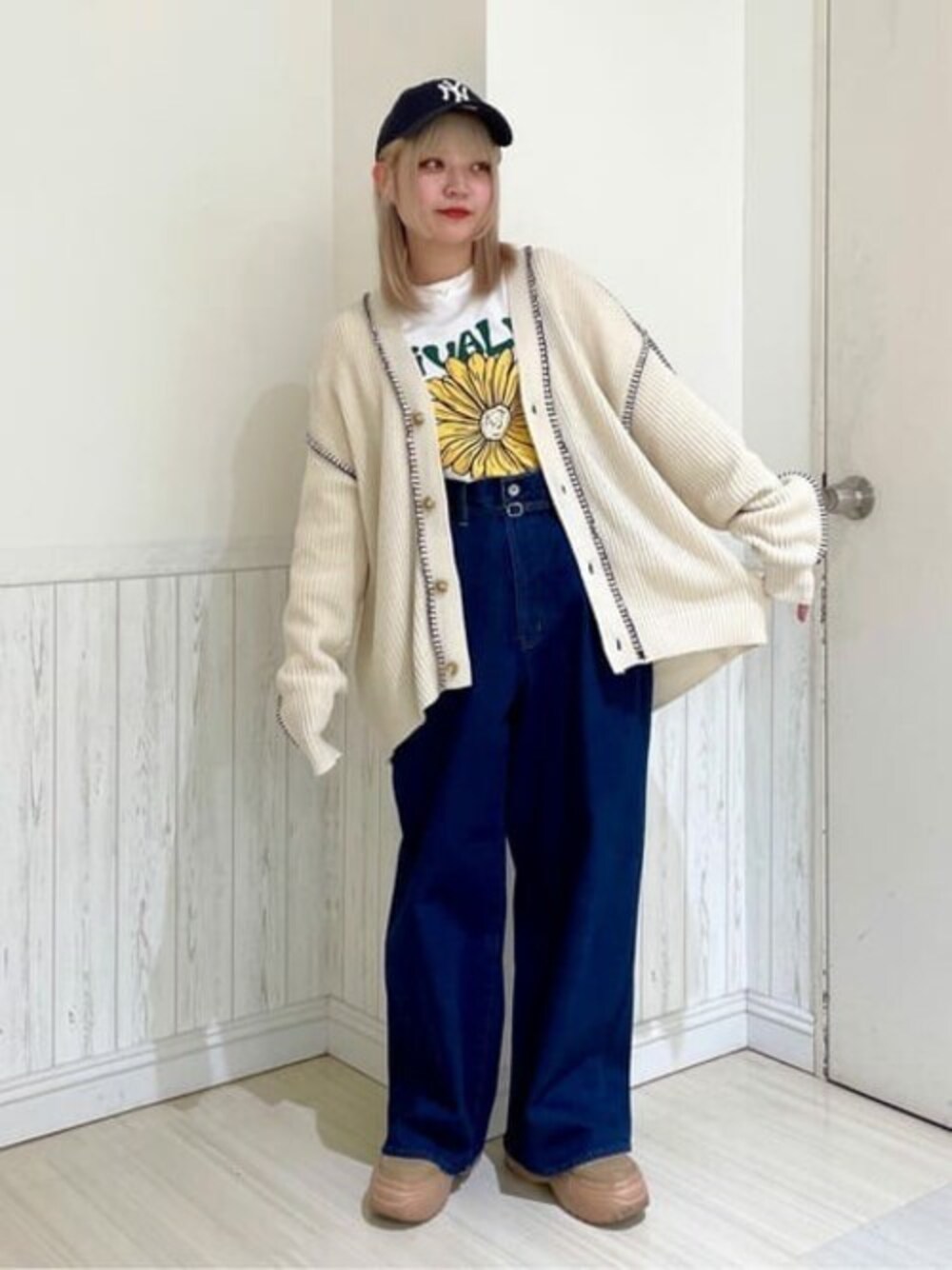 メンズ新作のSUPER BUGGY JEANS! 同素材のベルトが付いているので1番キツくして、ウエストより高い位置で履きました✌🏻 ウエストとか丈感はSサイズで良かったですが 太いデニムが好きなのでMサイズが丁度いいです✨ オールシーズン使えるので男女共におすすめです❣️