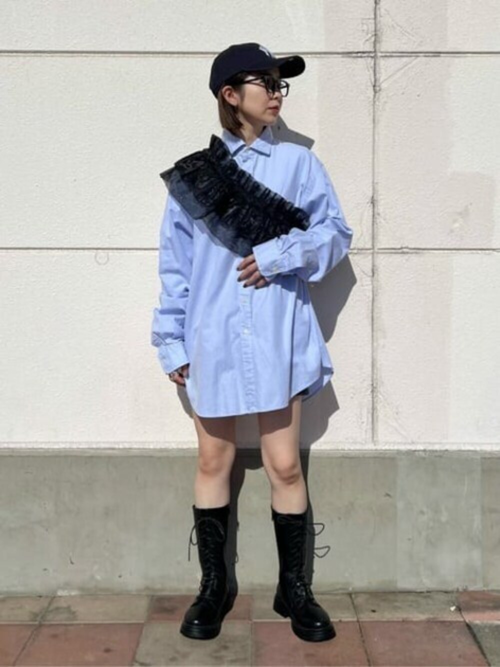 160cm / 足23.0cm / 骨格ウェーブ の私が着用◎ 春らしい爽やかなコーディネート‼︎ サックスカラーのシャツをメインに NEWERAとブーツを合わせてカジュアルに◎ 古着のシャツはゆったりしたBIGシルエットで 抜け感を演出した古着mixコーデです♡