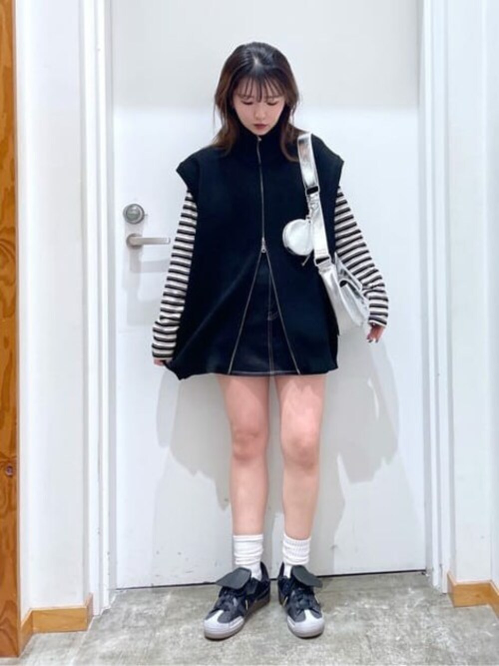 152センチ インナー/フリーサイズ トップス/Lサイズ ボトムス/XSサイズ カジュアルな雰囲気を持つ、低身長の方でも着こなせるコーデ♪ ミニスカートがハイウエストなスタイルアップしてみえます♪