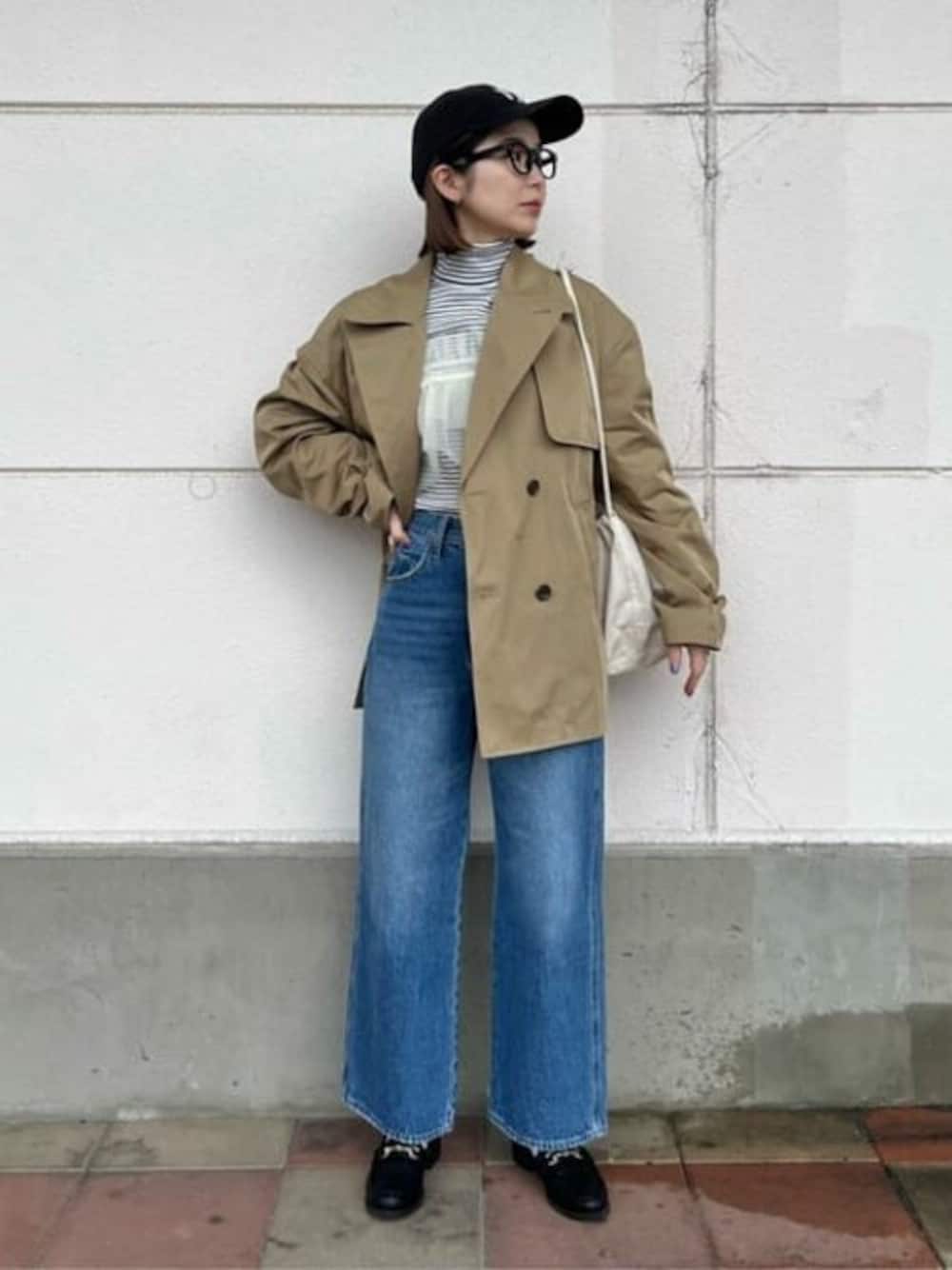 160cm / 足23.0cm / 骨格ウェーブ の私が着用◎ 大人コーデにぴったりの 可愛いショートトレンチコート♡ ユニセックスで使えるデザインで 春のお出かけコーデにオススメです‼︎ シンプルデザインのデニムパンツと メガネやキャップでカジュアルダウン◎