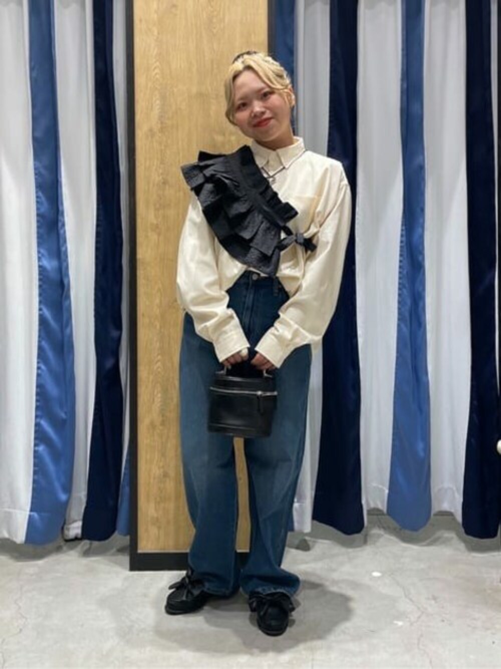 ストライプシャツを使った春コーデです💐 かっちりしがちなシャツもトレンドの つけフリルを重ねてカジュアルダウン さらにデニムを合わせて全体的にカジュアルで統一させてみました💡