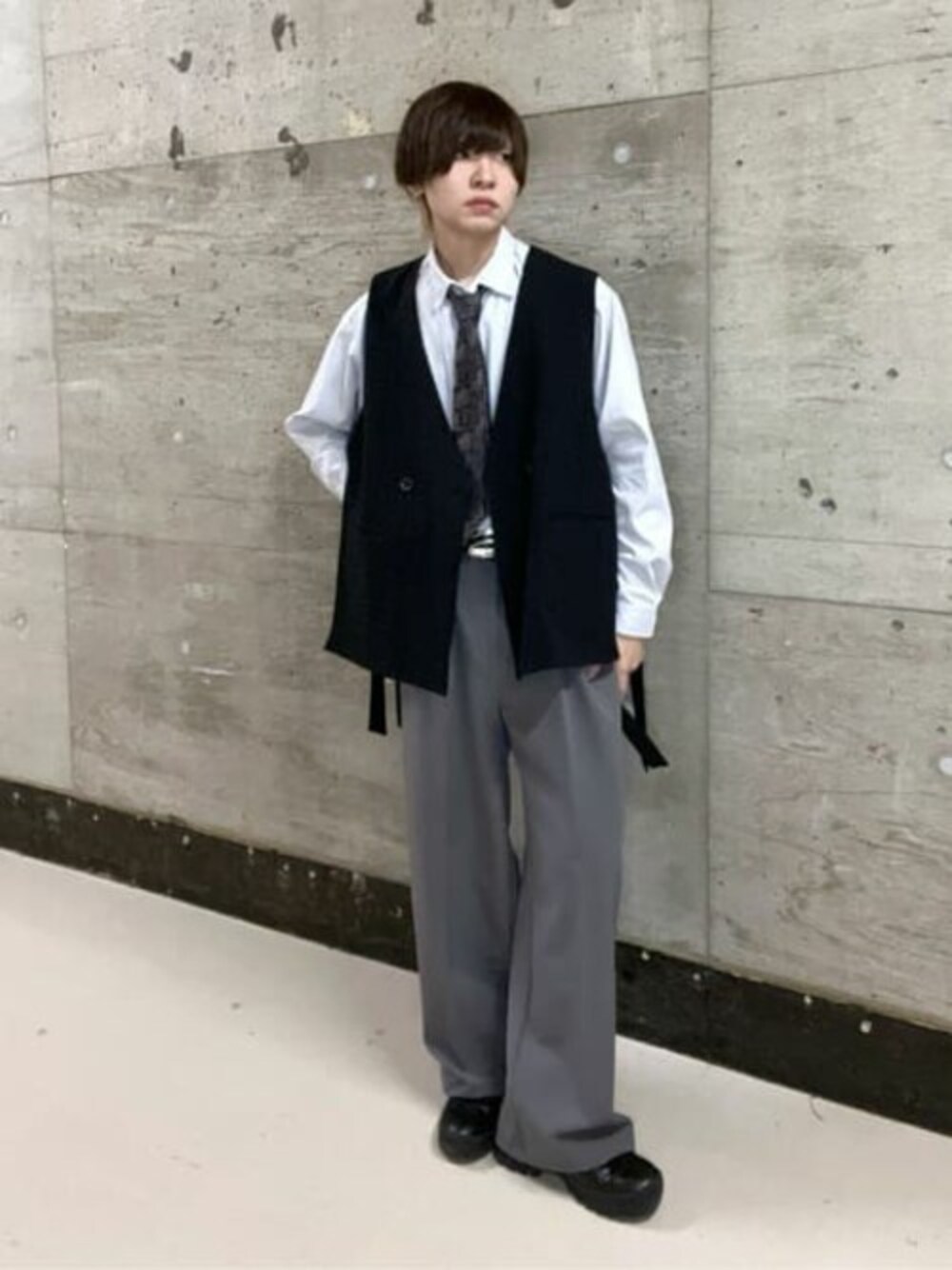 羽織っているベストはポリレーヨン混合の光沢感ある生地しかも厚めで高見えします! さらに流行りのベストに紐が垂れるデザインで刺さる人には刺さるアイテム。 デートにもおすすめ◎