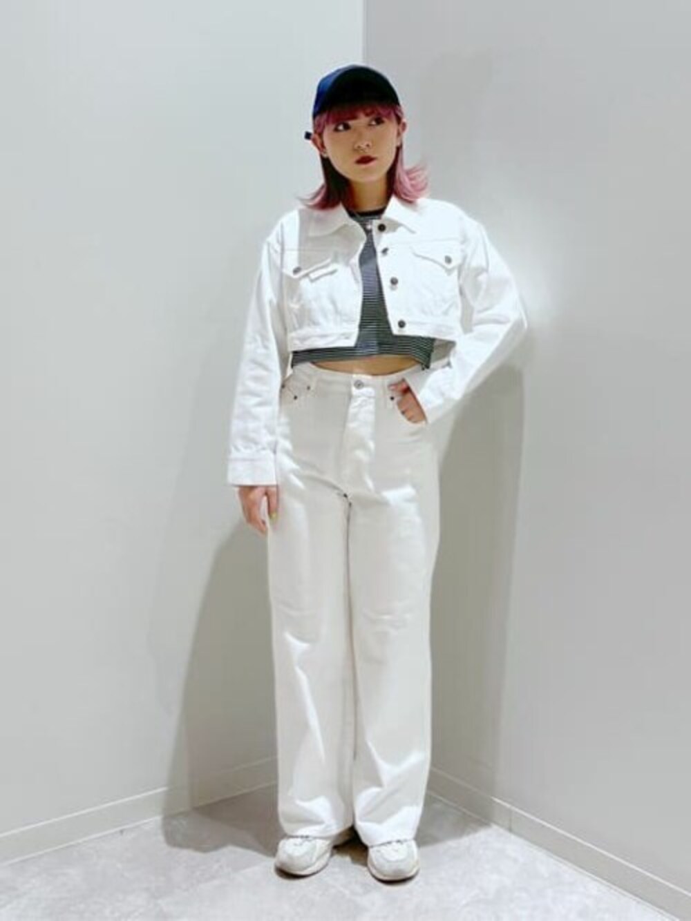 デニムショートジャケットを使ったオールホワイトデニムコーデ🤍 ショート丈のアウターとストレートデニムパンツを合わせることで、大人っぽいコーデに✨