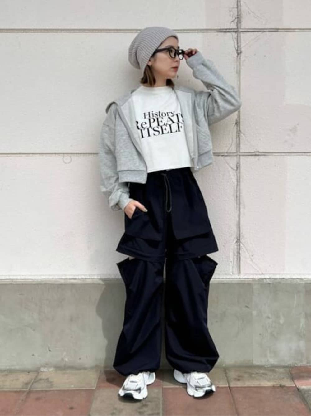 ナイロンパンツはジップ付きで 少し開けて着こなすとトレンド感があって◎
