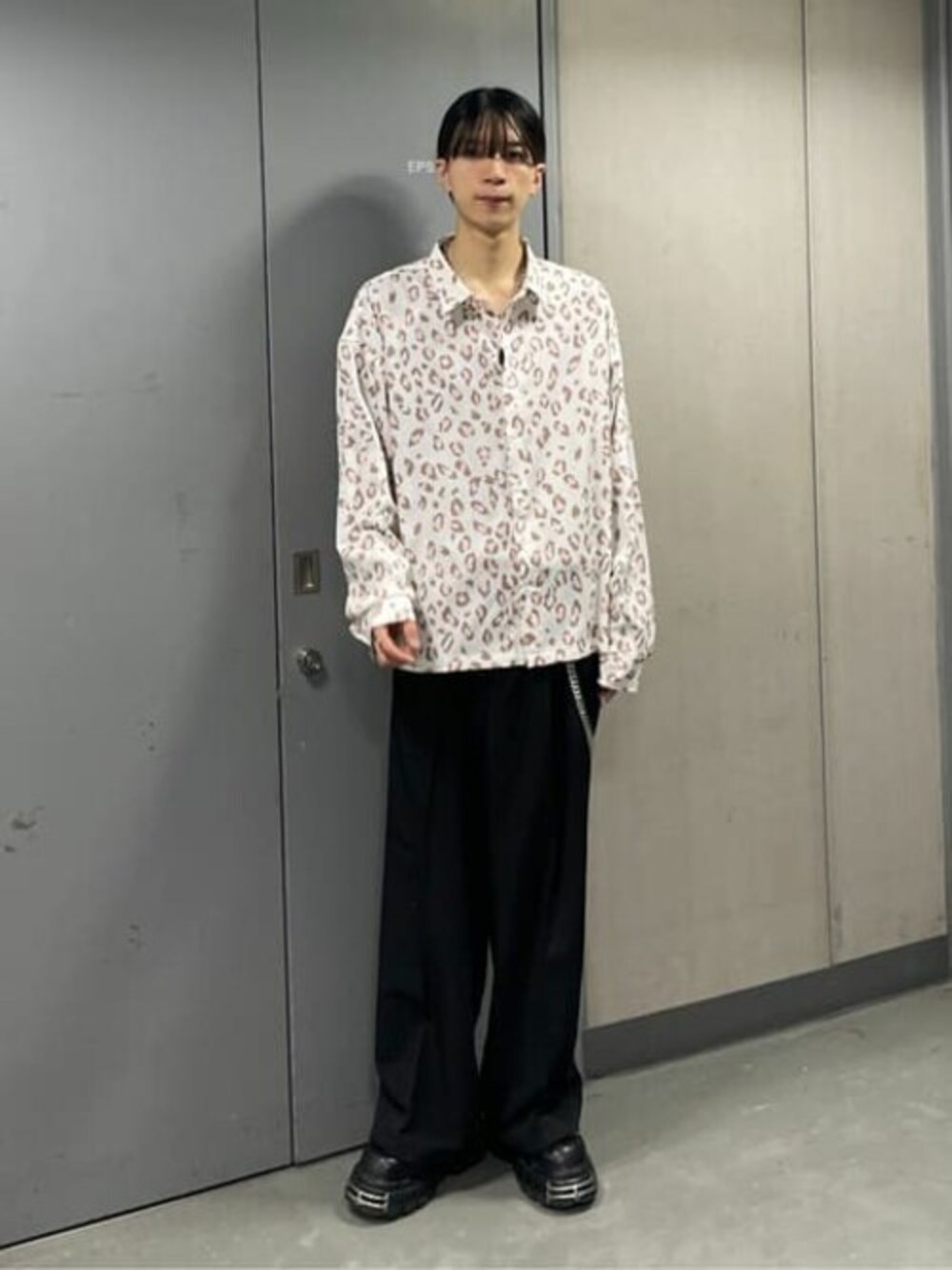 スーパーバギースラックスとアムンゼンプリントシャツを使ったコーデです! レオパード柄やアニマル柄のシャツなど、キレイめな春コーデにぴったりです。