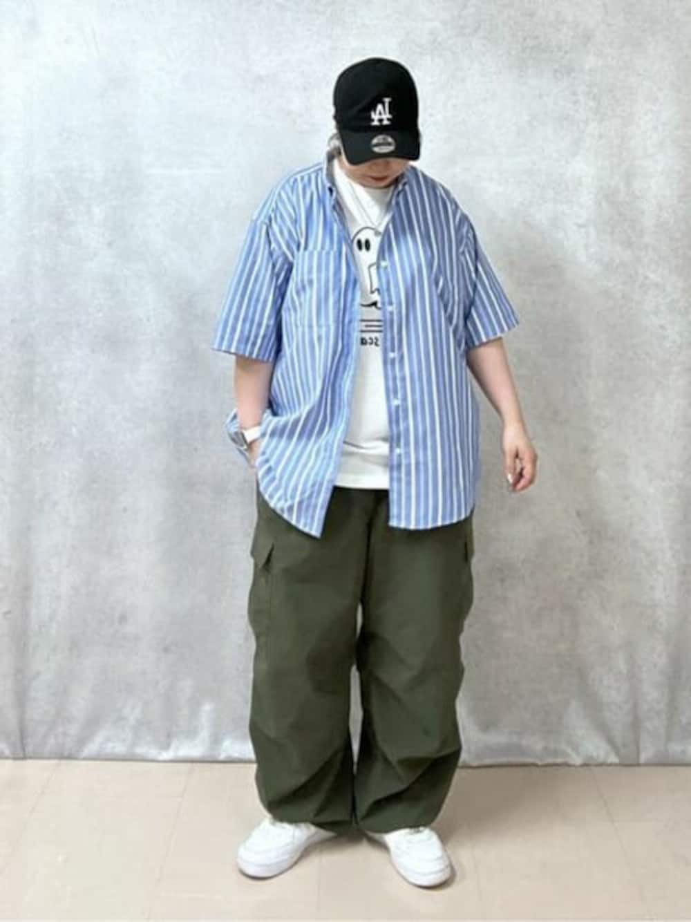 162cm 着用サイズ ・tops/Lサイズ ・bottom/Mサイズ ヒップが隠れてゆったり着用できるシャツは、流行りのオーバーサイズ着用ができてトレンド感抜群!! ブルーストライプは爽やかな色味なので、夏にぴったりですよ〜🐋🤍 デニムパンツと合わせたカジュアルテイストにも◎ カーゴパンツと合わせたストリートファッションにも合わせられるので、着回し力抜群のシャツです🌟
