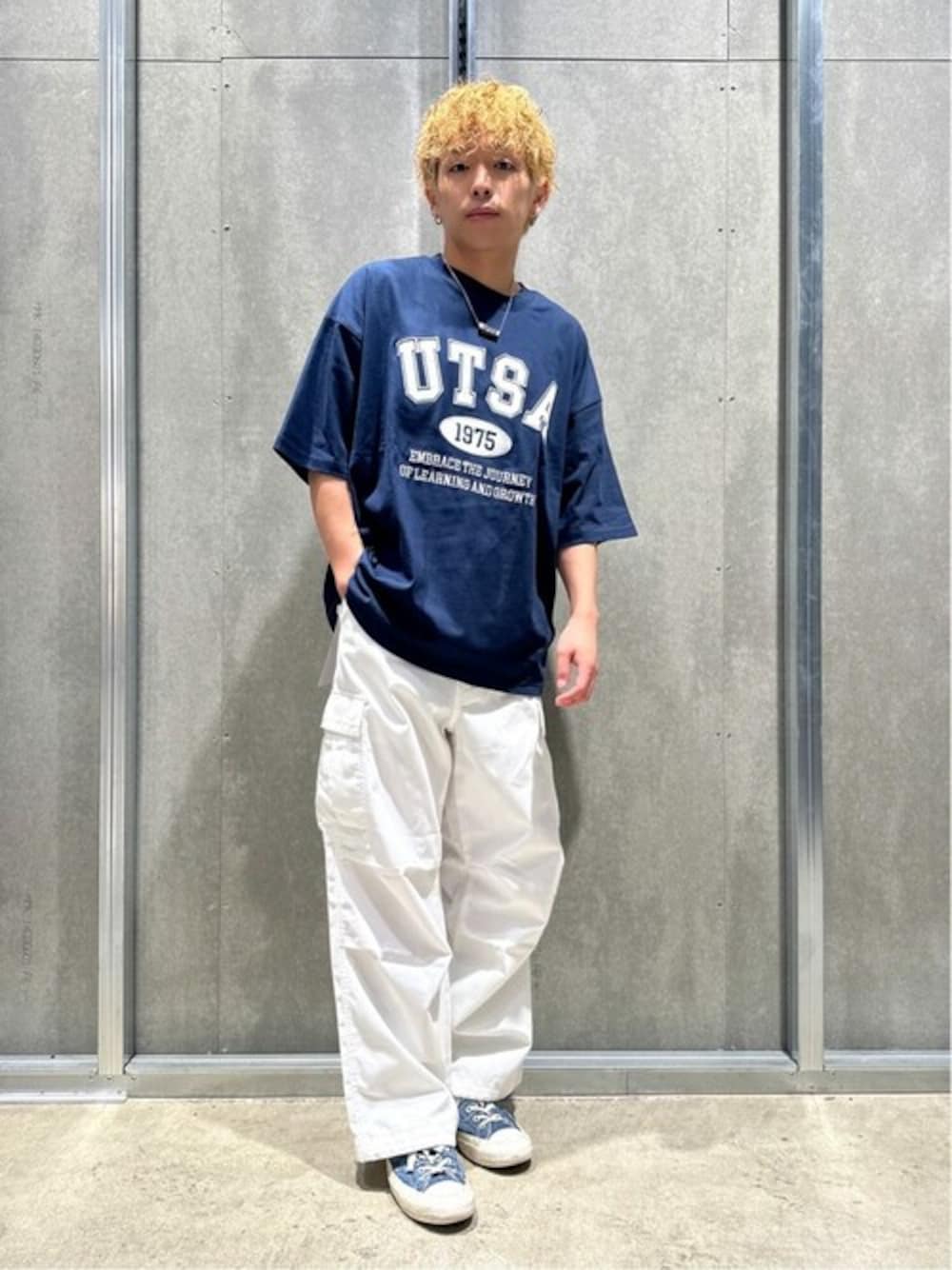 カーゴパンツを使ったストリートスタイル! カレッジロゴとの組み合わせがお気に入り♪