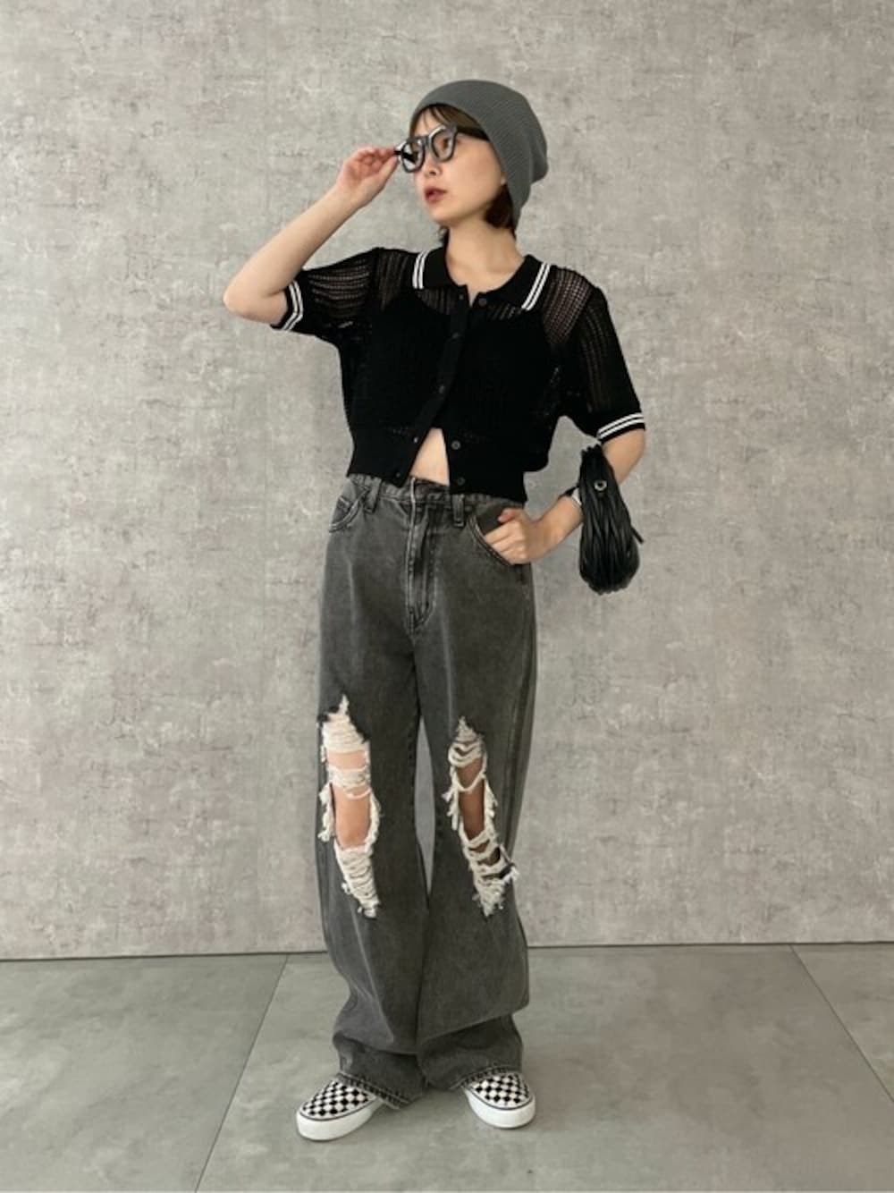 襟付きのメッシュトップスとダメージデニムの組み合わせがオススメ❗️