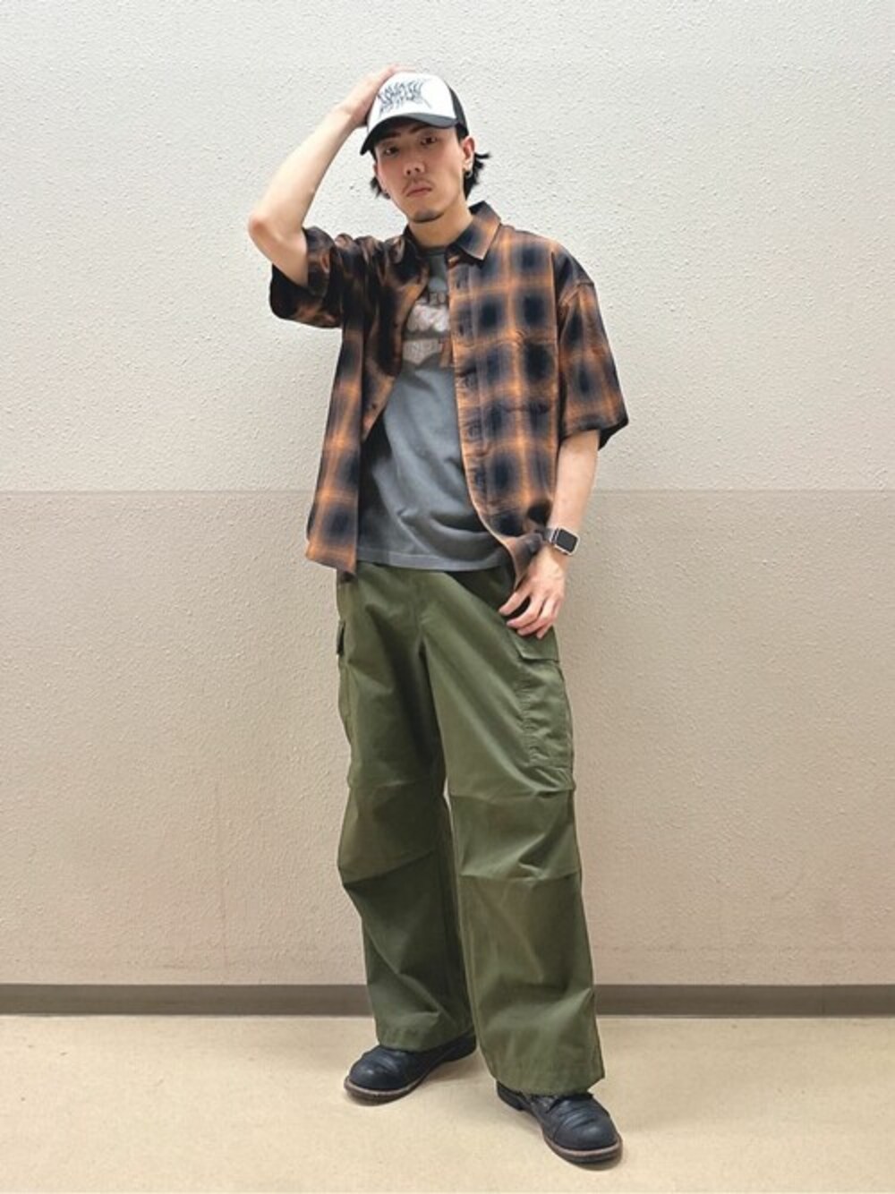 オンブレチェックシャツのオレンジを使ったコーデです! パンツはカーゴパンツやデニムがおすすめです!