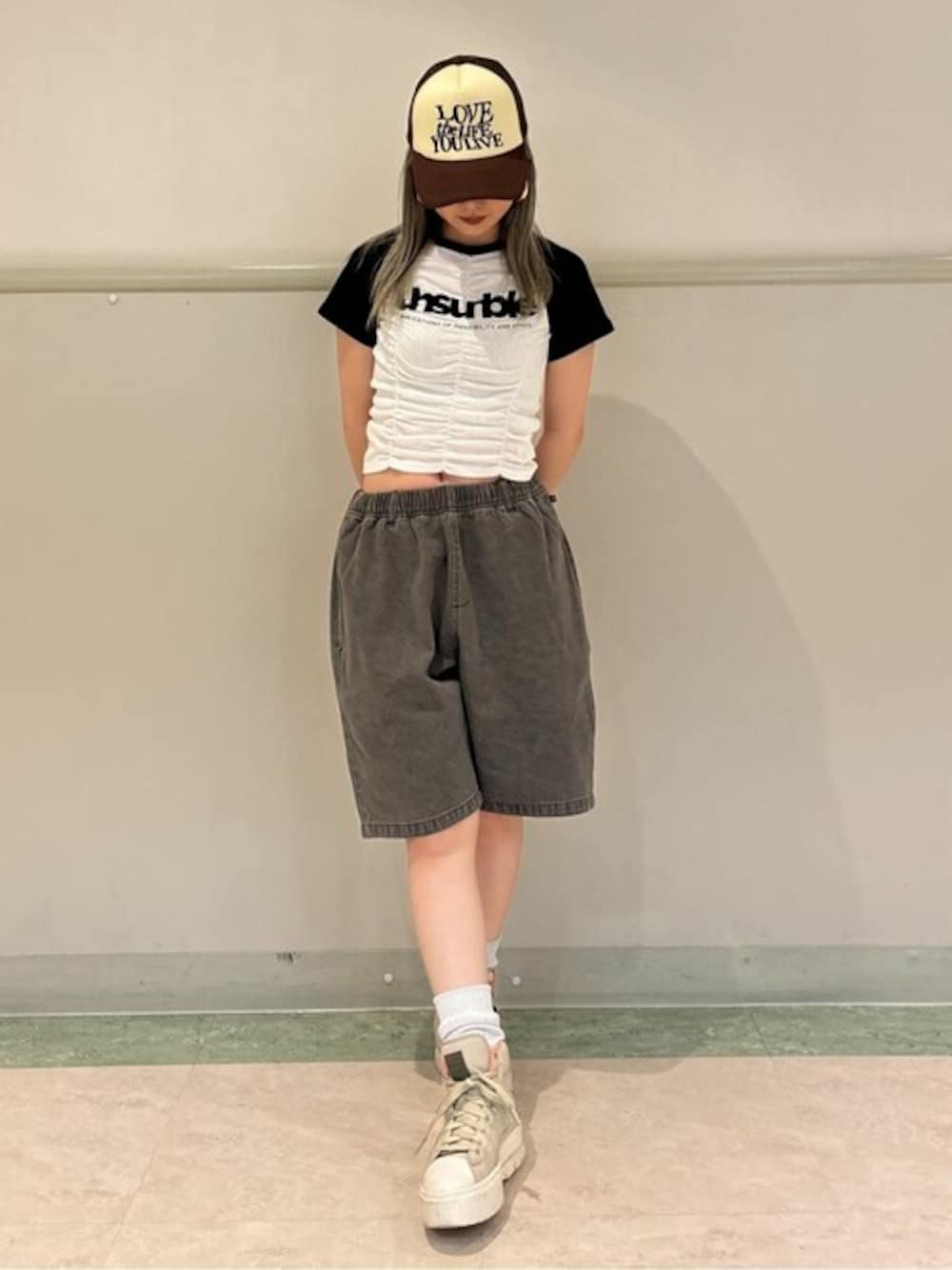 リラックスイージーショーツとチビTと合わせて 体のラインが見えるようなコーデにしてみました✌ キャップも合わせて 今流行りの海外コーデ❣️