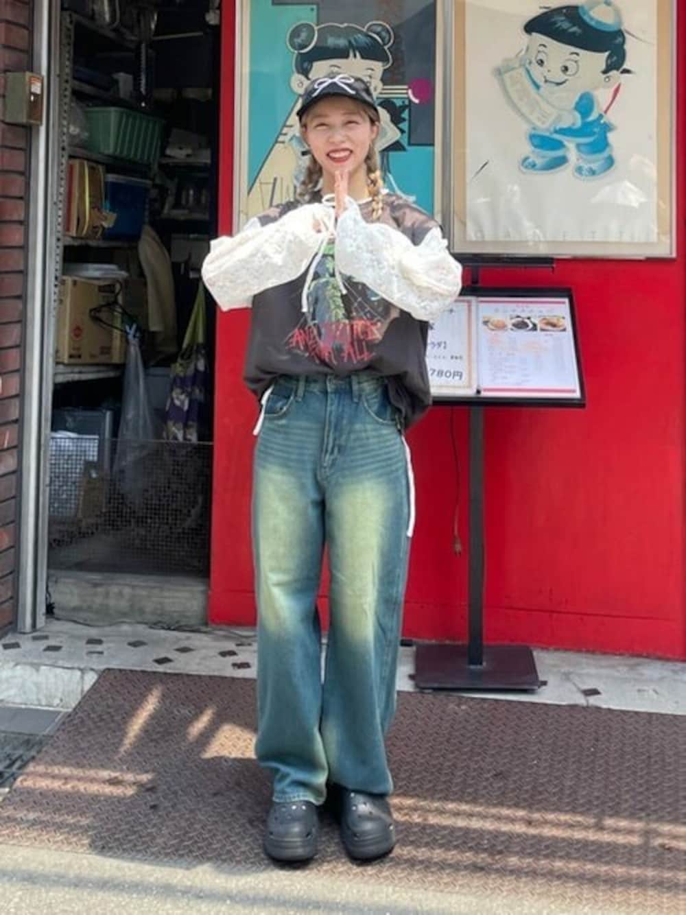 ヴィンテージ加工のデニムがお洒落で レースにタンクトップをレイヤードした 古着ガーリー風にしてみました^_^ レースの袖はドロストで絞れます^_^