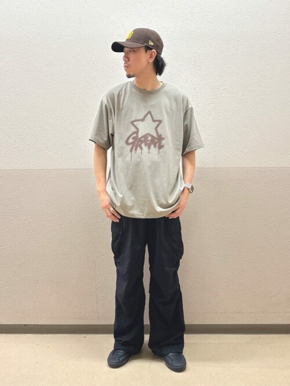 グラフィックTシャツにナイロンカーゴパンツを合わせてラフなストリート、スケーターコーデを組んでみました! 今のトレンドっぽくナイロン生地のパンツを合わせるのがおすすめ! 全体的に重いカラーにならないように小物でTシャツと同系色のキャップを合わせてます!