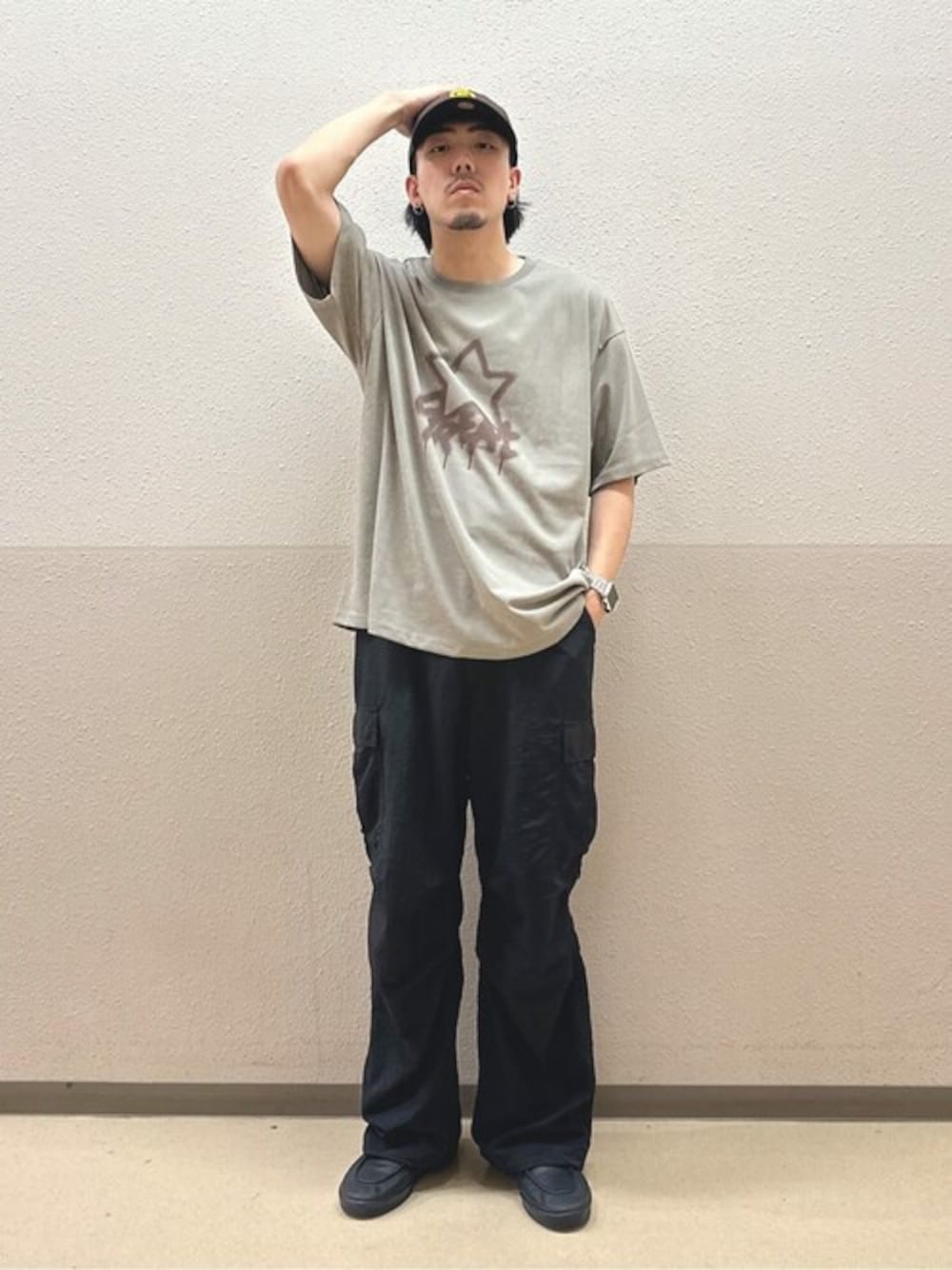 グラフィックTシャツにナイロンカーゴパンツを合わせてラフなストリート、スケーターコーデを組んでみました!今のトレンドっぽくナイロン生地のパンツを合わせるのがおすすめ!全体的に重いカラーにならないように小物でTシャツと同系色のキャップを合わせてます!