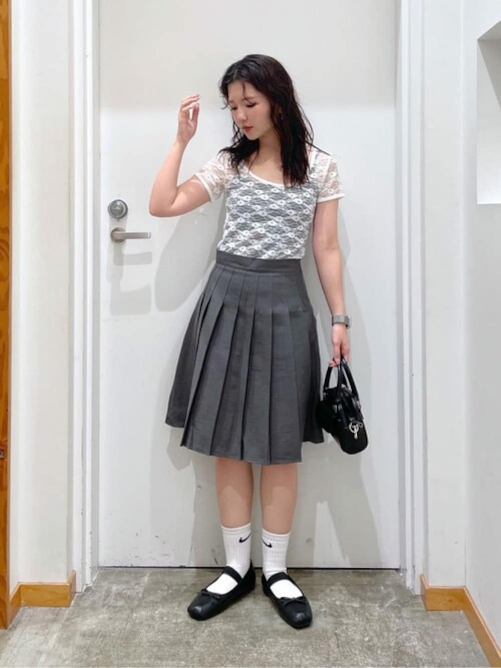 ミドル丈のプリーツスカートは一癖あって周りと差をつけられるアイテム♪ サイドにチャックがあるので着脱しやすいです! レースTは首回りが空いているのですっきり見える♪