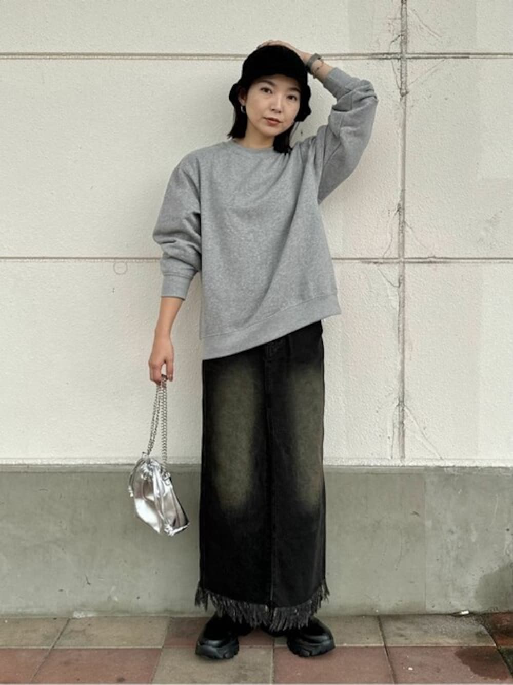 160cm / 足23.0cm / 骨格ウェーブ の私が着用◎ シンプルで使い勝手の良いカラースウェット‼︎ やっぱりグレーが使いやすくてオススメ♡ 大人コーデにもハマります◎ ウォッシュ加工がポイントのデニムスカートは 裾のフリンジがオシャレで可愛いアイテムですよ