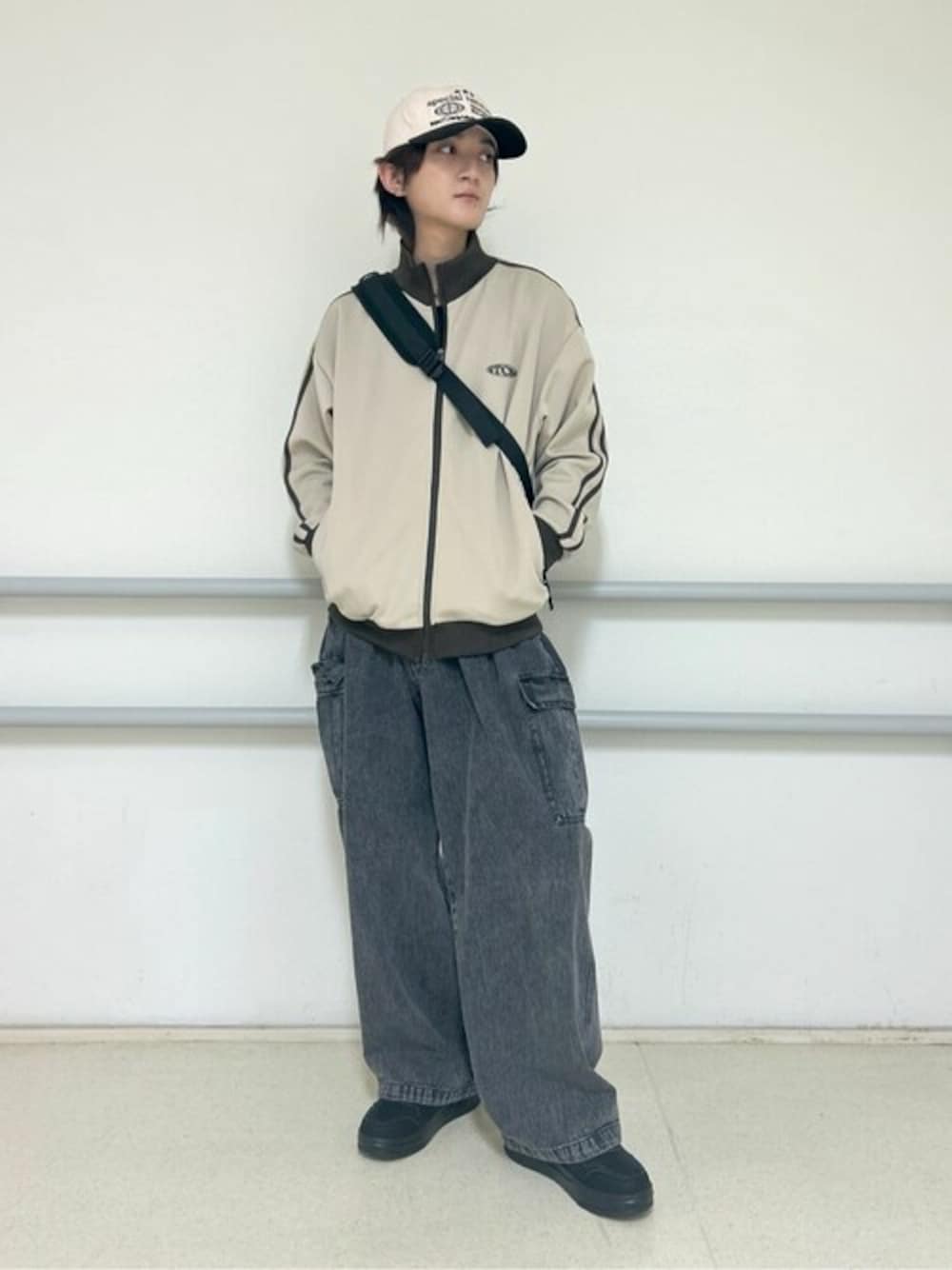 ライントラックジャケット 172cm細身でMサイズ着用 サイズ感はゆったりと着れました! ダブルジップで着方を変えれます♪ デニムカーゴパンツ 172cm細身でLサイズ着用 サイズ感はゆったりと着れました◎ 裾は絞って履けるので、スタイリングに合わせて変えて履くことができます!