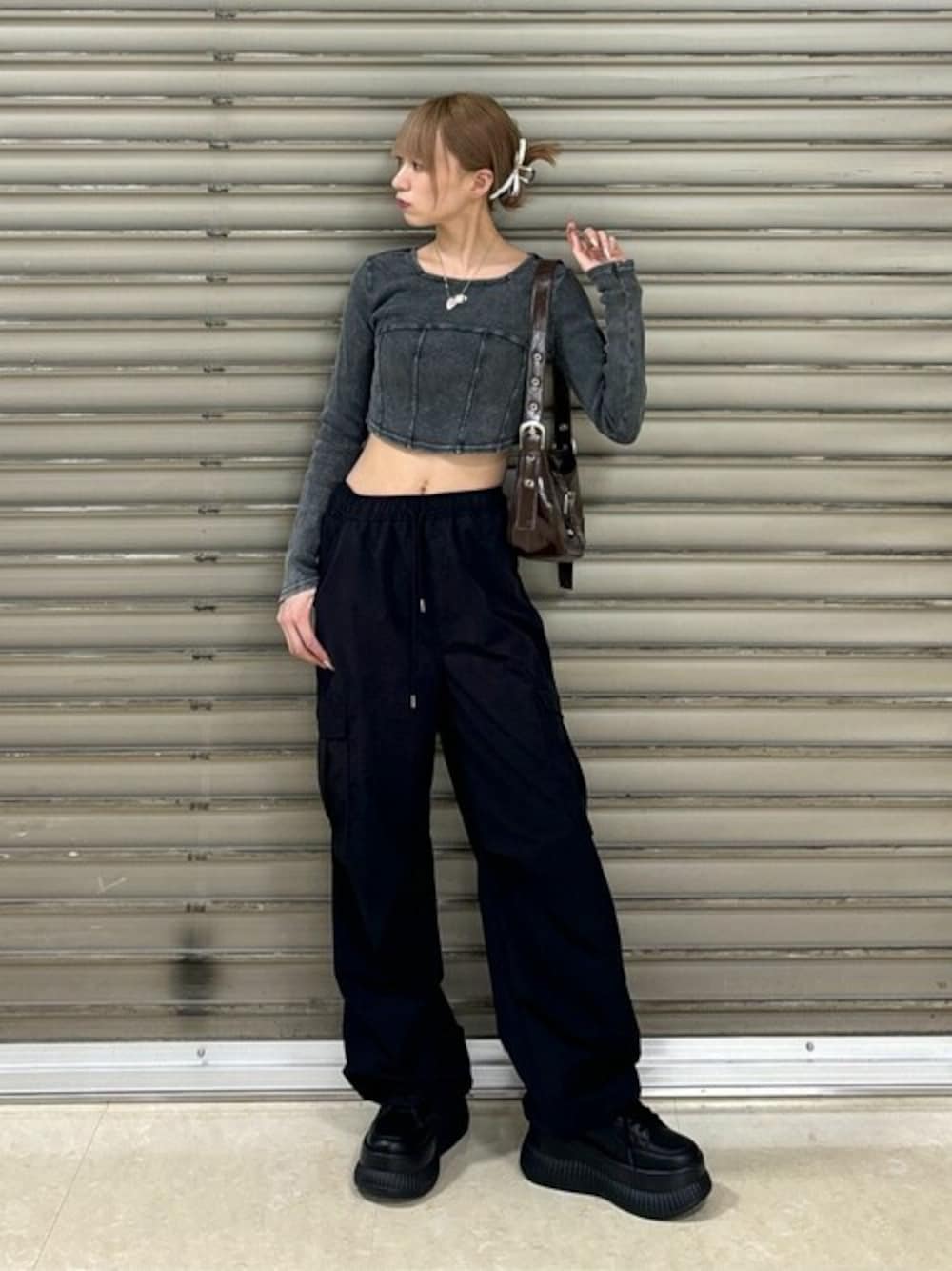 ♡オールブラックコーデ♡ シンプルなコーデに肌見せすることで大人ギャルコーデっぽく仕上げてみました~✌︎ カーゴパンツは楽なのにかわいいトレンドアイテム! トップスのカラーを問わずに合わせられるので私はブラックがお気に入り‼︎ 丈は大きめなのでウエストサイズに合わせてSサイズをチョイスしました^ ^♡ 厚底のスニーカーを合わせることで更にスタイルアップするのと、このスニーカー横から見た時の形が超かわいい。。。( ; ; ) 前から見てもまるっこくてボリュームがあるのでミニボトムスと合わせても、細見えできちゃいます~◎ 是非参考にしてみてください♡