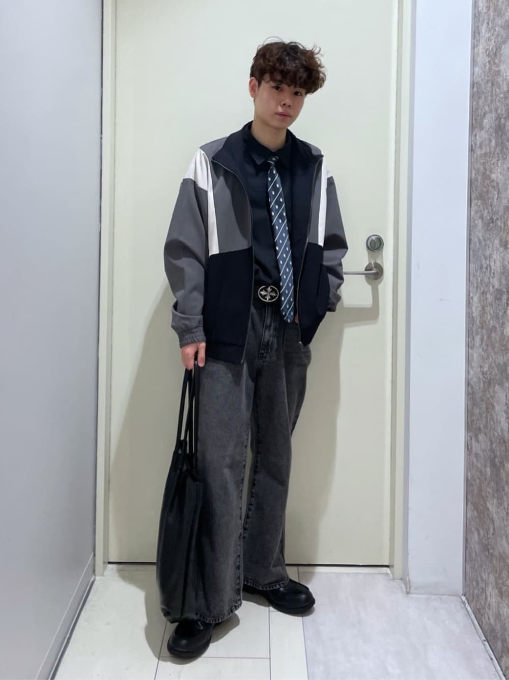 新作のトロミスタンドブルゾンとタイ付きシャツ、デニムルーズフレアパンツを合わせたコーデです!! 『トロミスタンドブルゾン』は見て分かるかっこいいデザインで寒くなる時期に迷わずコーデが組めるアイテムとなっております◎ 『タイ付きシャツ』はキレイめコーデやカジュアルコーデ、ストリートコーデ全てに対応出来る汎用性が抜群で、ネクタイ自体もかっこいいデザインが特徴です!!!! 『デニムルーズフレアパンツ』は足が長く見えるとこが特徴でシンプルなデザインなので色々なトップスに幅広く使えます!! 今回はレザートートバッグを使ってかっこいい雰囲気で合わせてみました!!!!