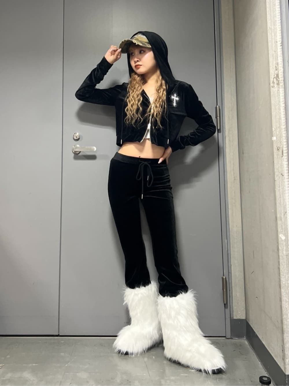 y2k GAL coordinate❤︎ 新作のベロアセットアップが可愛すぎる!! ラインストーンが胸元と、お尻についているデザインがギャルっぽくて◎! キャップや、ファーアイテムと合わせるとよりy2kに!上下別々でコーデを組むのも可愛い!