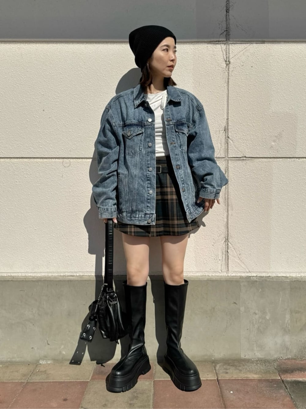 160cm / 足23.0cm / 骨格ウェーブ の私が着用◎ 男女ユニセックスで着用できるデニムジャケット‼︎ シンプルで使いやすいデザインです♡ チェック柄で秋らしいミニスカートは インナーパンツ付きで安心感◎ ベルト付きなのも嬉しいポイントです