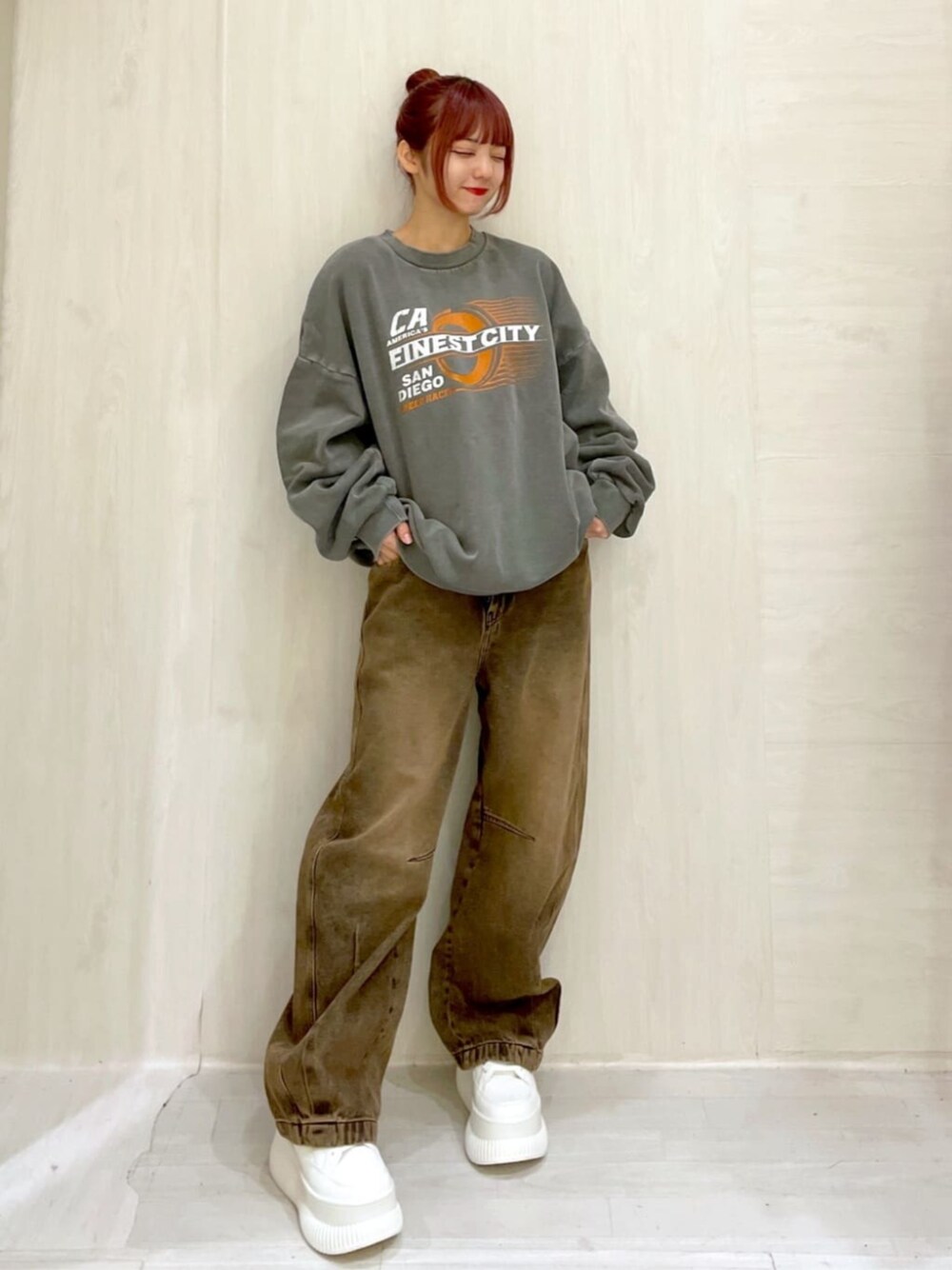 色褪せたスミクロでヴィンテージのある スウェット! BIGサイズでダボっと合わせてゆるーい お出かけコーデにも♡ ボトムスは今年流行りのカーブパンツ! ウエストが細身の女の子でも腰フィット抜群!