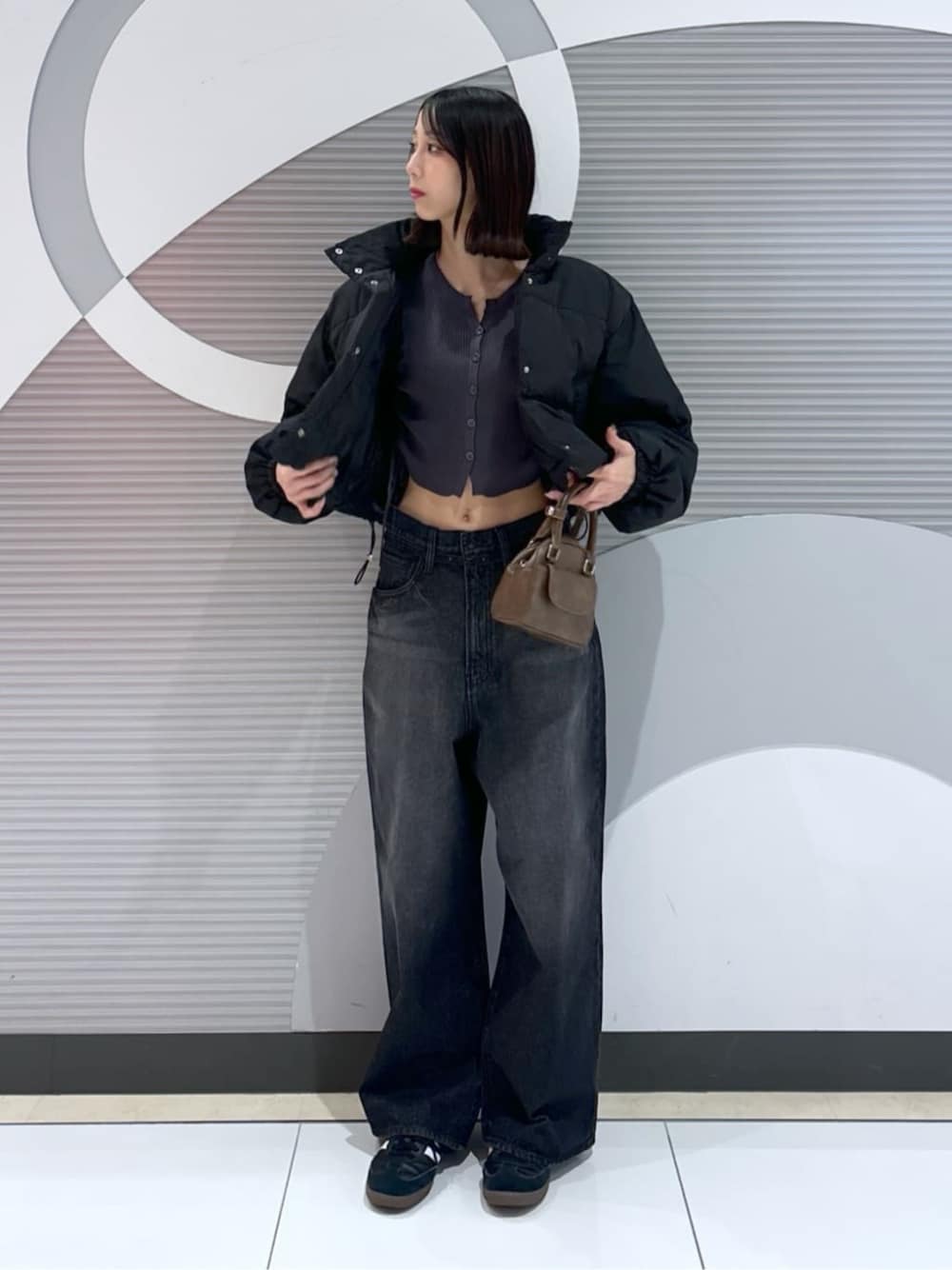パディングショートブルゾンを使って メンズライク×Y2Kコーデ! ハイウエストのバギーとショート丈の アイテムを合わせる事で脚長効果抜群に◎ ブラウンのミニバッグを合わせることで トレンド感満載( ^0^)/
