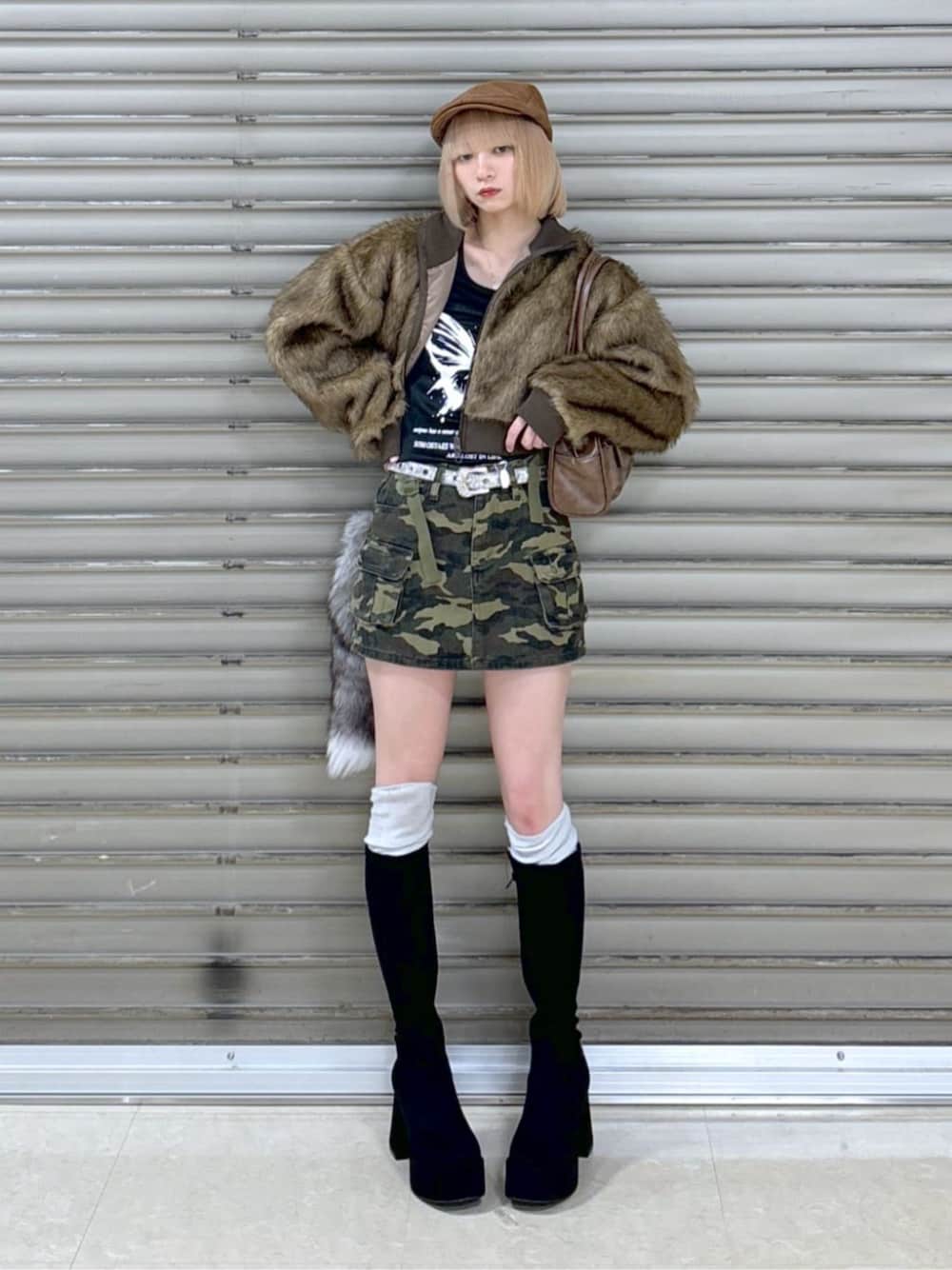 ♡ガオガオ獣堪能コーデ♡ この新作アウター入ってきた瞬間からバキュンと狙い撃ちされてしっかり手に取ってしまいました^ ^♡ ブラウンなのに濃すぎなくて、ガーリーなテイストでも着こなしができちゃいそうなファーアウター。。。ついつい触りたくなっちゃうしとってもあたたかい〜‼︎ しかもしかも超軽いんです~♡これは持っておいて損なし✌︎ 丈が短めなのでフルジップもかわいいですが、私は肩を少し落として着るのがスキです^ ^ デニムとの相性はもちろんですが、今回は迷彩柄のミニボトムスを合わせてY2Kコーデを組んでみました~ ギラギラベルトを身につければ今日の主役は私で間違いなし⭐︎ メンズっぽいコーデには太めのベルトを、女の子っぽいコーデには細めのベルトをすると雰囲気が出てgoodです◎ トレンドの大きな尻尾をつければ、獣感マシマシに。。。♡ 写真映えも間違いなしです✌︎ 是非参考にしてみてください〜!