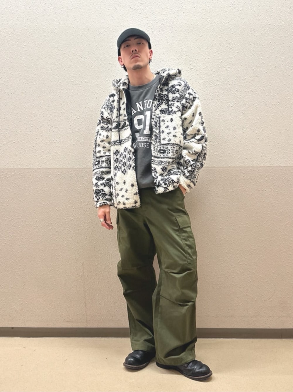 ボアアウター、ピグメント加工スウェット、カーゴパンツで合わせたストリートコーデになります!アウターのペイズリー柄がコーデのアクセントに!ホワイト、ブラック、カーキの3色かつ合わせやすいカラーでコーデを組んでいるので誰でも挑戦しやすくおすすめです!