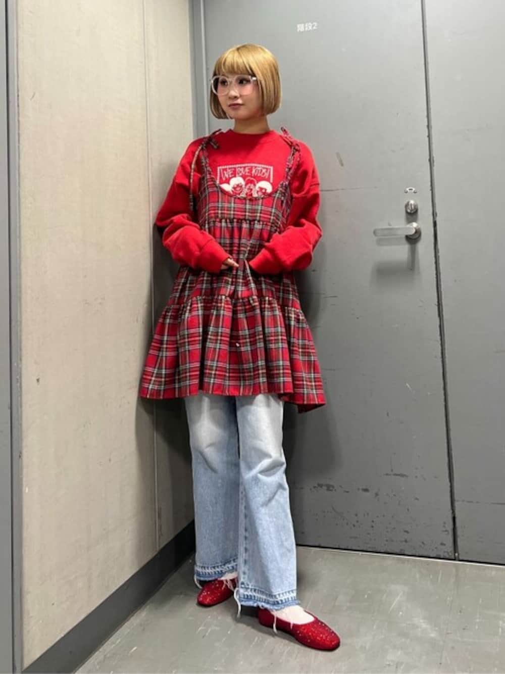 赤チェックコーデ❤︎ 私のリアルな出勤コーデです! WCのミニワンピースは、スタッフ人気もすごく高いアイテムで、ニットやロンTと相性ばつぐんです! 肩の部分調節可能で、上から重ね着しても可愛い!セミフレアデニムパンツは、ややフレアなので脚が綺麗に見えてスッキリ見せ◎ 切りっぱなしなのでアメリカンなコーデや、ストリートなトップスとも合います◎!