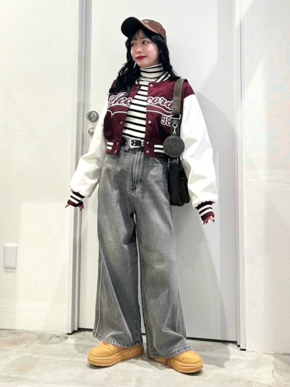 スポーティコーデ✨️ ◎スタジアムロゴショートスタジャン ・Fサイズ トレンドのショートスタジャン.ᐟ.ᐟ 落ち着いたレッドカラーが可愛い🍿 新作ワイドパンツと合わせた大人スポーティスタイル👀✌️