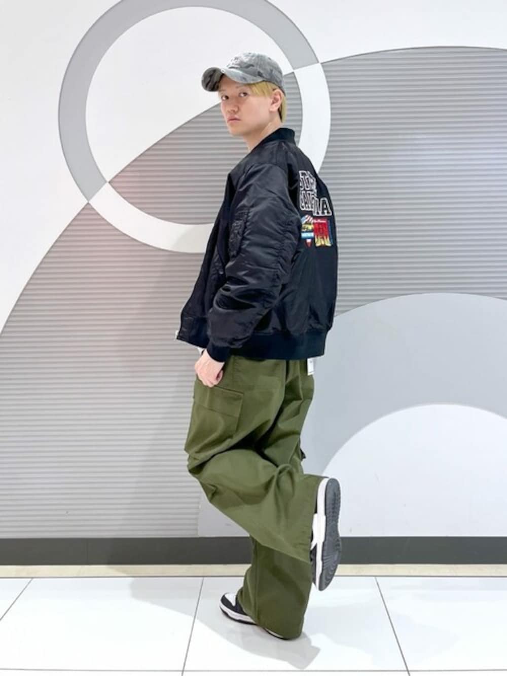 MA-1を使用したストリートコーデ! カーキのカーゴイージーパンツと合わせてよりストリートっぽく!