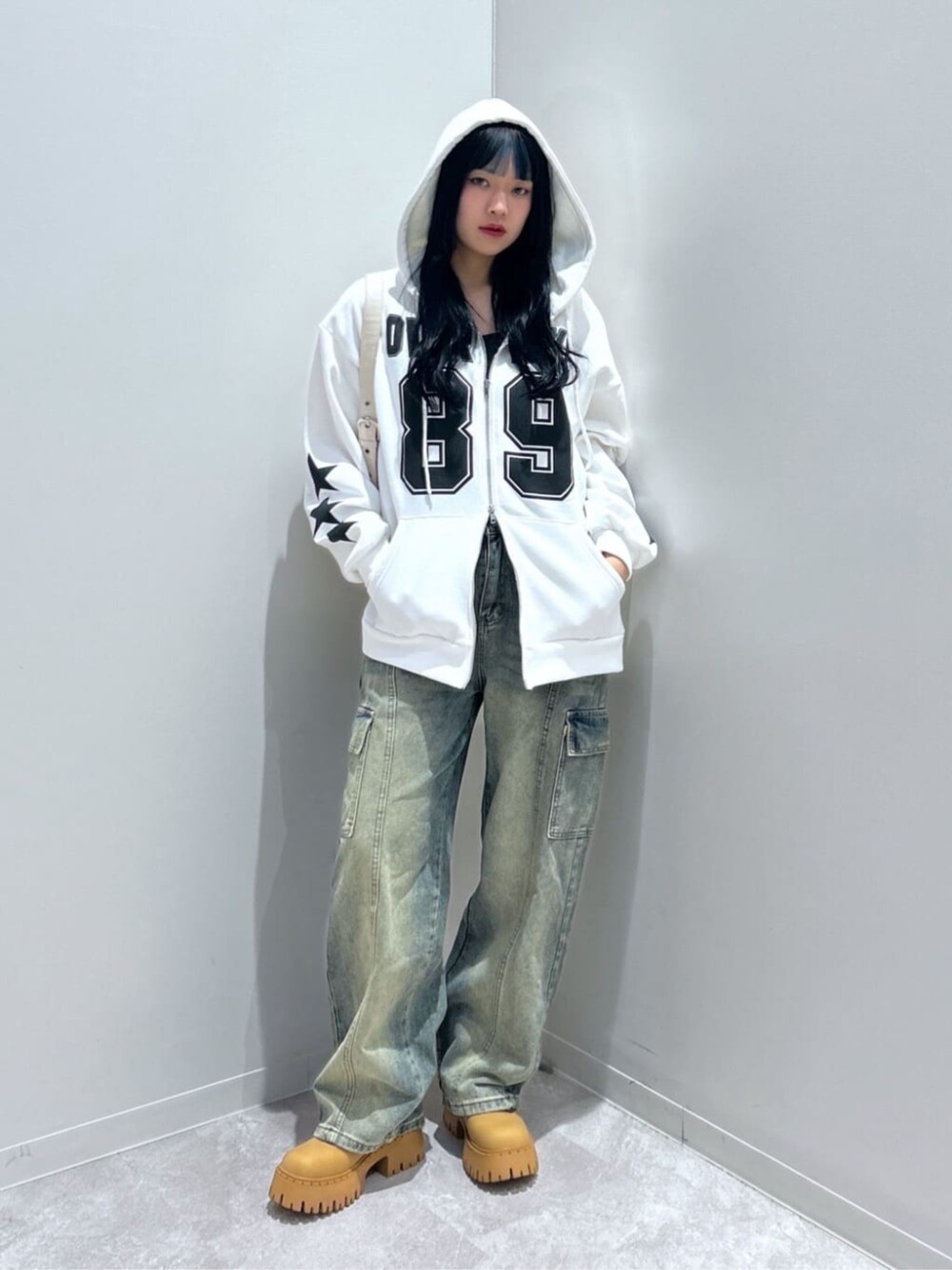 パーカーはダブルジップになっているので、私は真ん中に寄せて着てみました! アレンジが可能なのでオススメ! 裏起毛になっていて暖かいしシルエットが全体的に大きめになっているのでストリートコーデに合わせやすい! デニムパンツと合わせてストリート感もアップ!⬆️👍🏼