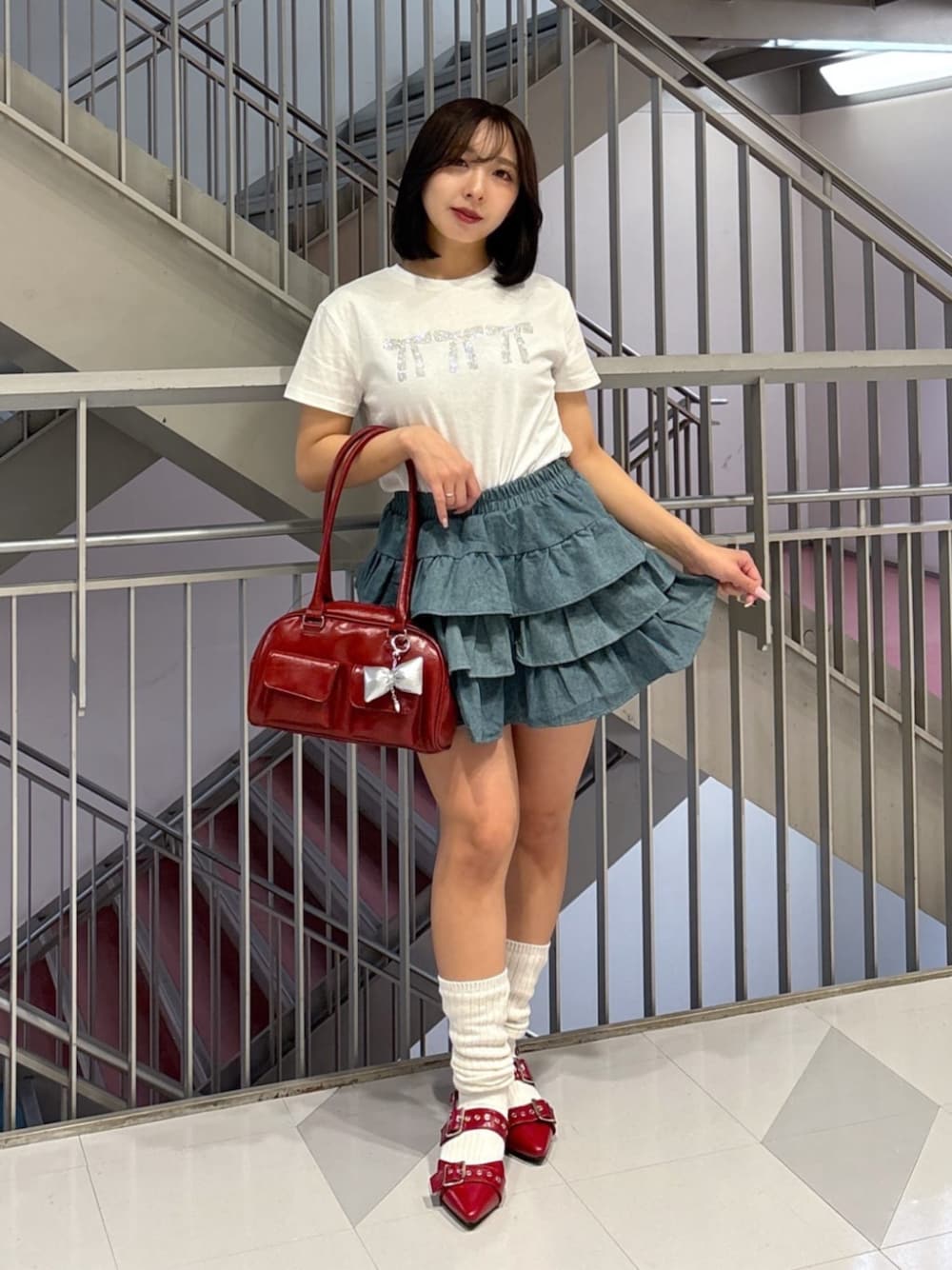 ホワイト生地にビジューリボンがさりげなく可愛らしさを出せる♡ スカートもデニム生地にすることでカジュアルに落とし込めます♪ 「白Tにデニムはマスト」これを少しアレンジするだけで印象はだいぶ変わります♪ 差し色で小物をレッドにすると上級者感も醸し出せますよ☺︎♡ 🎀ホワイト×デニム×レッド=可愛い🎀 覚えておくとこれから使えます🎶
