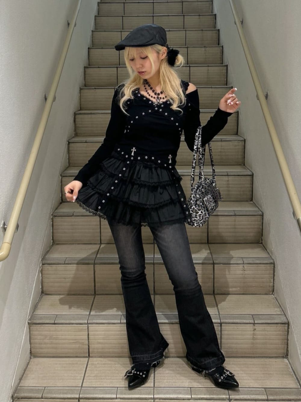 ギャルっぽいトップスに甘めなフリルのスカートを合わせてみました! トップスはトレンドのオフショルデザインになっていて、程よい肌見せができるのでこれからの季節にオススメのアイテムです! フレアパンツはとにかくシルエットが綺麗! 履くだけで脚が細長く見えてスタイルアップ効果抜群です★★ 155cm、骨格ストレートの私は今回Mサイズを着用しました! フリルのスカートは1枚で履いても、フレアパンツとレイヤードしてもかわいい! 1枚持っておいて間違い無しだと思います!🎶