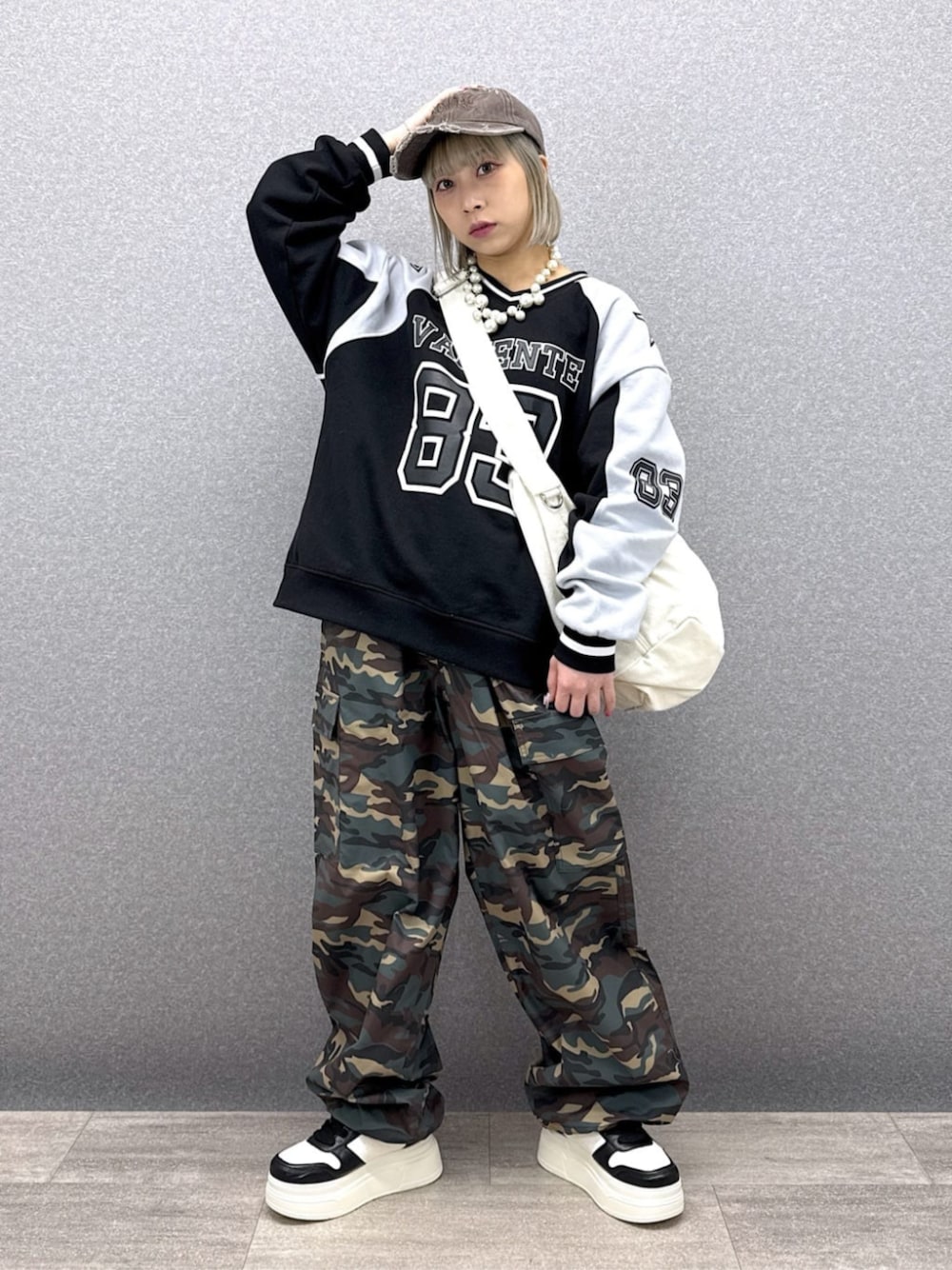 パンツはウエストと裾が絞れて、 調節がきくので低身長女子でも着れちゃいます◎ 全体的にルーズシルエットなので 厚底を合わせると裾を引きずる心配ない上に、 バランスが取りやすいです!