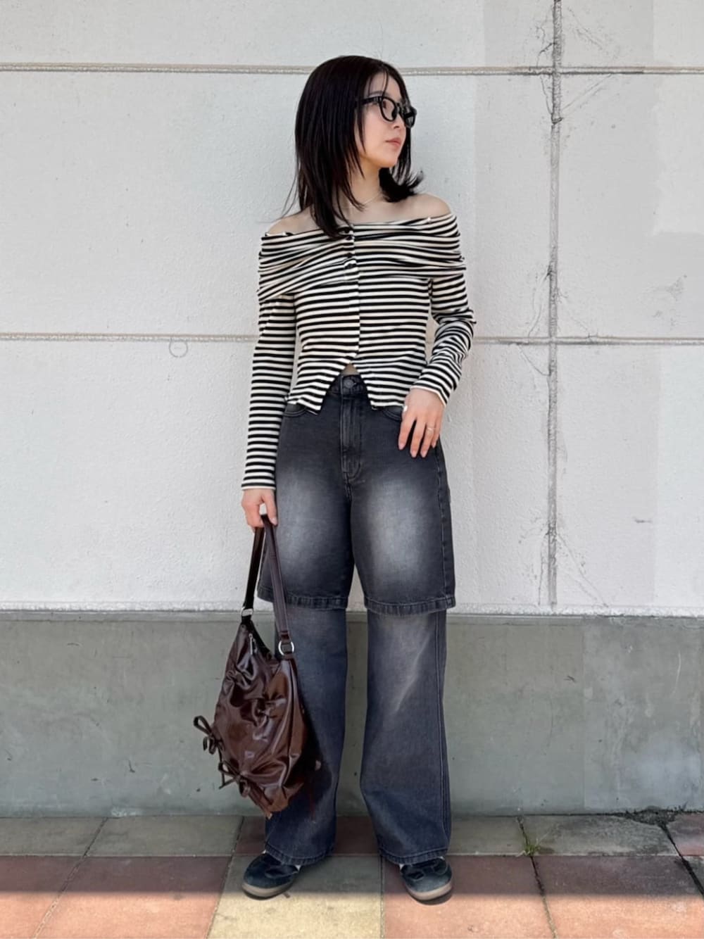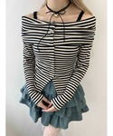 160cm / 足23.0cm / 骨格ウェーブ の私が着用◎ ボーダーが春らしいオフショルロンT!! 首周り華奢見えしてオススメです ハーフパンツは今期トレンドアイテム◎ デニム地で使いやすくオススメです♡ 同色のフルレンパンツと合わせた レイヤードスタイルも◎