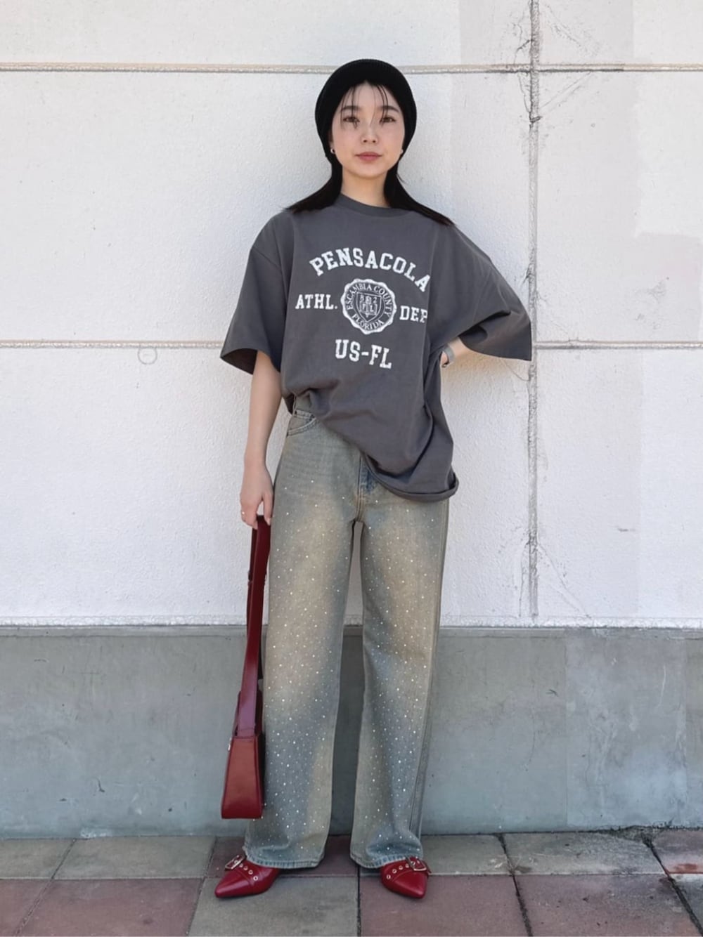 160cm / 足23.0cm / 骨格ウェーブ の私が着用◎ ヴィンテージ感のあるカラーが可愛いプリントT!! メンズサイズで体型カバーも叶います◎ トレンドのビジュー付きデニムパンツは 程良いきらきら感でいつものコーデを 格上げしてくれるアイテムですよ♡