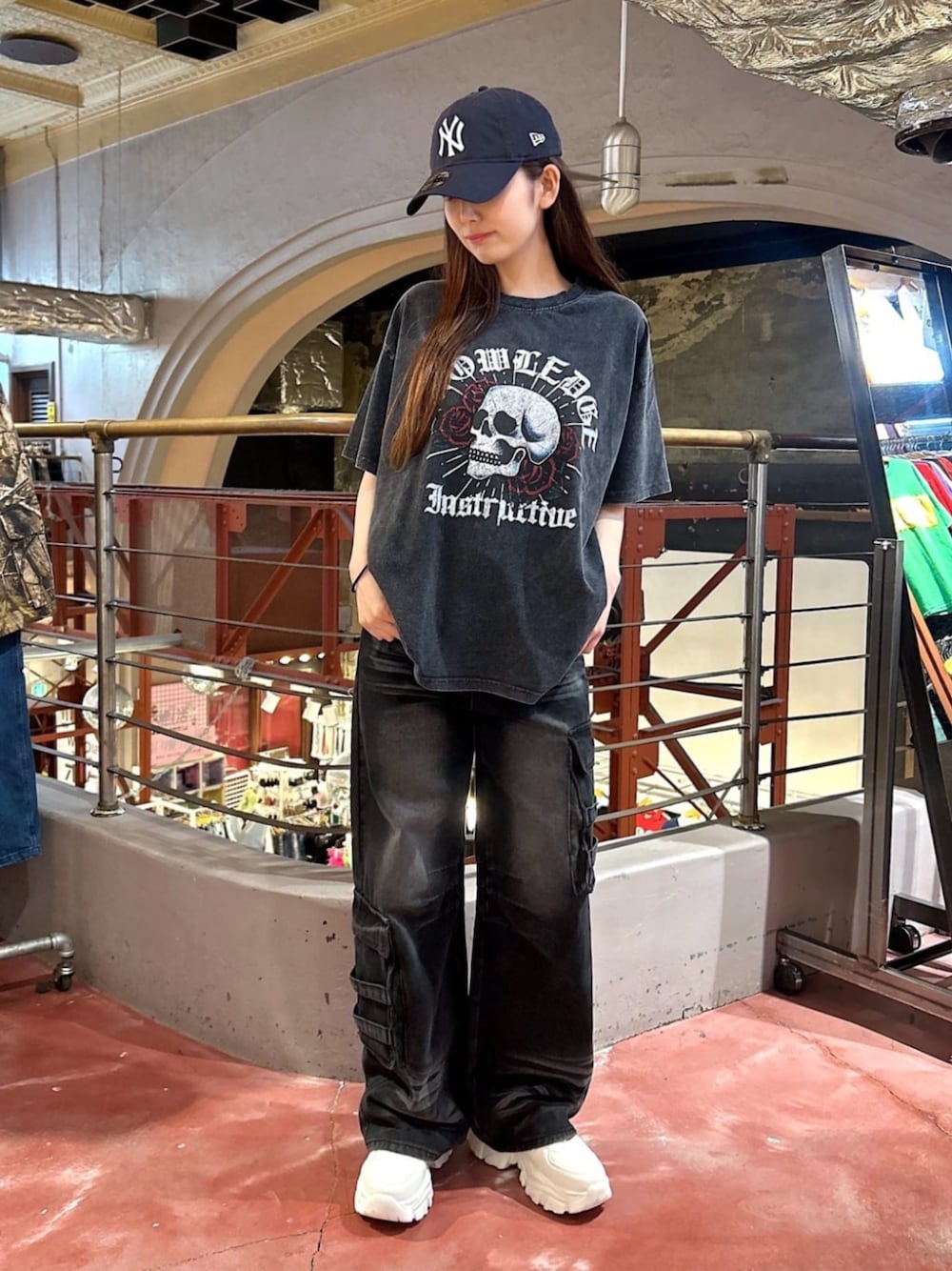 Tシャツ:FREE ボトムス:S スニーカー:L ウォッシュ加工の色味とドクロのデザインが可愛すぎるBIGTシャツ!💀 パンクスタイルにもおすすめ🎸 160cm、freeサイズ着用でヒップにかかるくらいの丈感です◎ デザインに優れたカーゴパンツ! 1着でコーデの主役になること間違いなし! 普段はM着用ですが、Sで少し大きいくらいです!Lまであるので、メンズの方でも履いて頂けます!