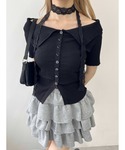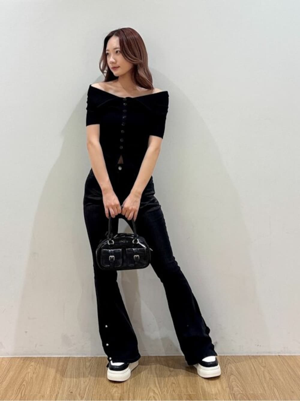 韓国コーデ! トップスはオフショルデザインになっていて、韓国系やギャル系におすすめ🖤