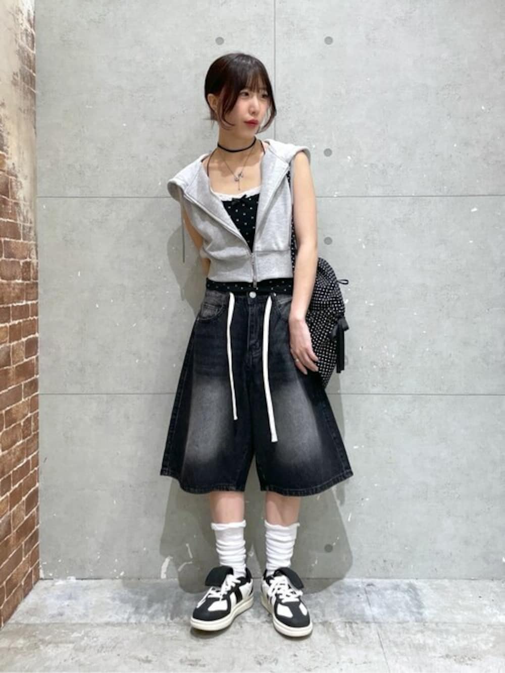 ハーフパンツを使った韓国ストリートコーデ! ドット柄を差し色にいれてモノトーンでもメリハリのあるコーデに♥
