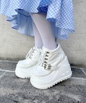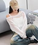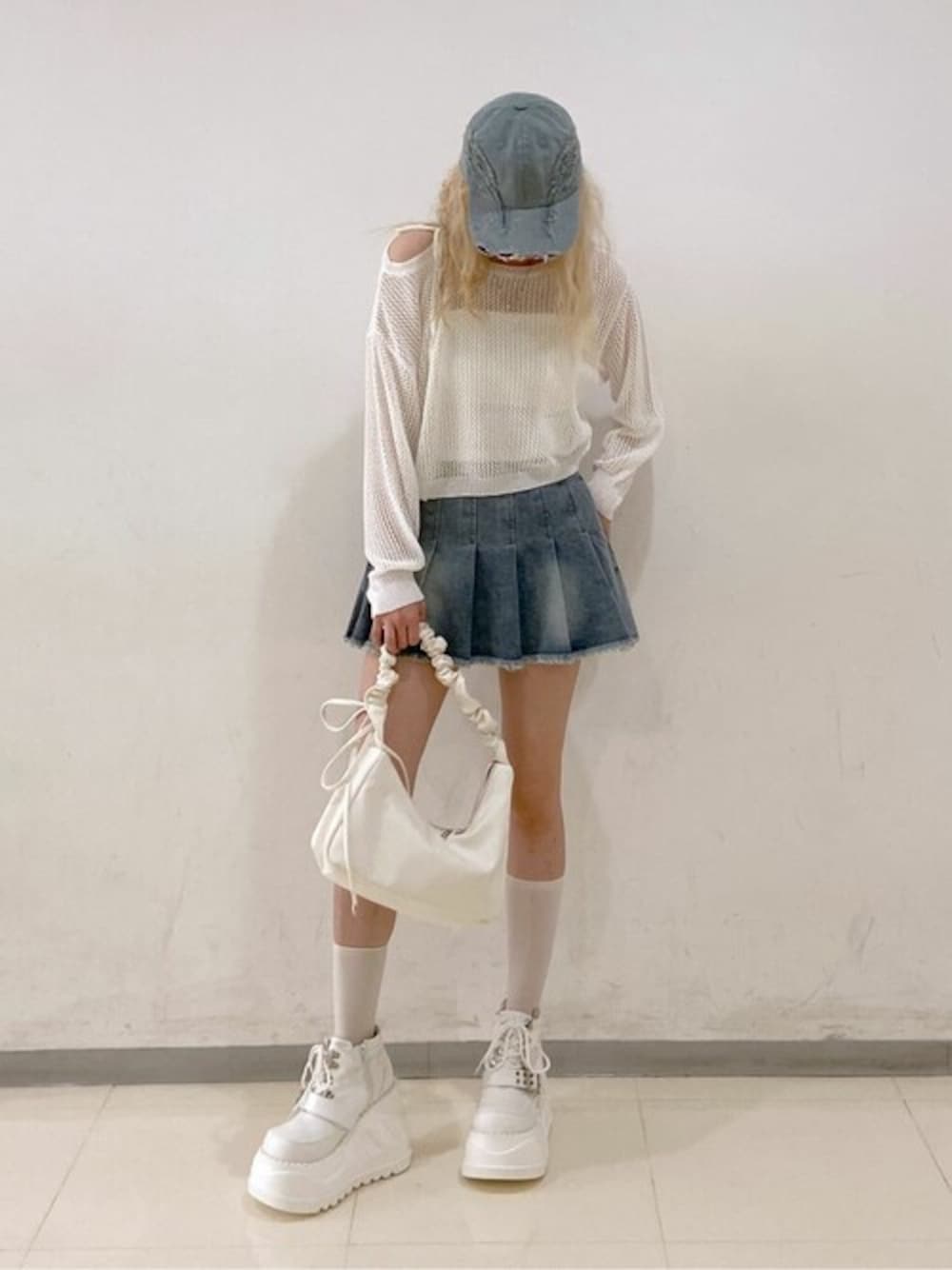 ざっくりと編まれたホワイトのメッシュニットに、 デニムプリーツミニスカートを合わせた、爽やかガーリースタイルです🌿