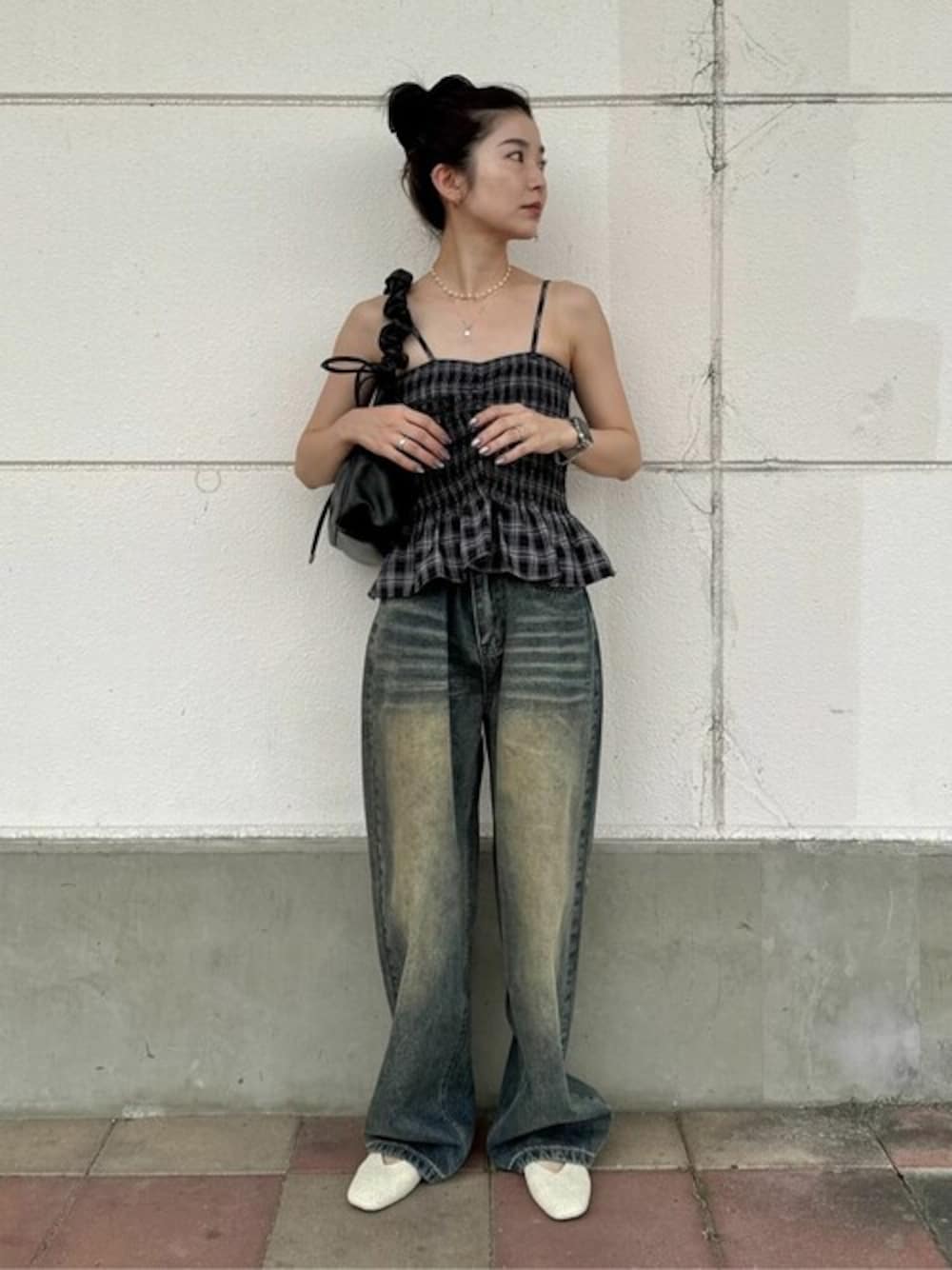 ワイド感が可愛いデニムパンツは ヴィンテージ風な色合いがこなれ感あって◎