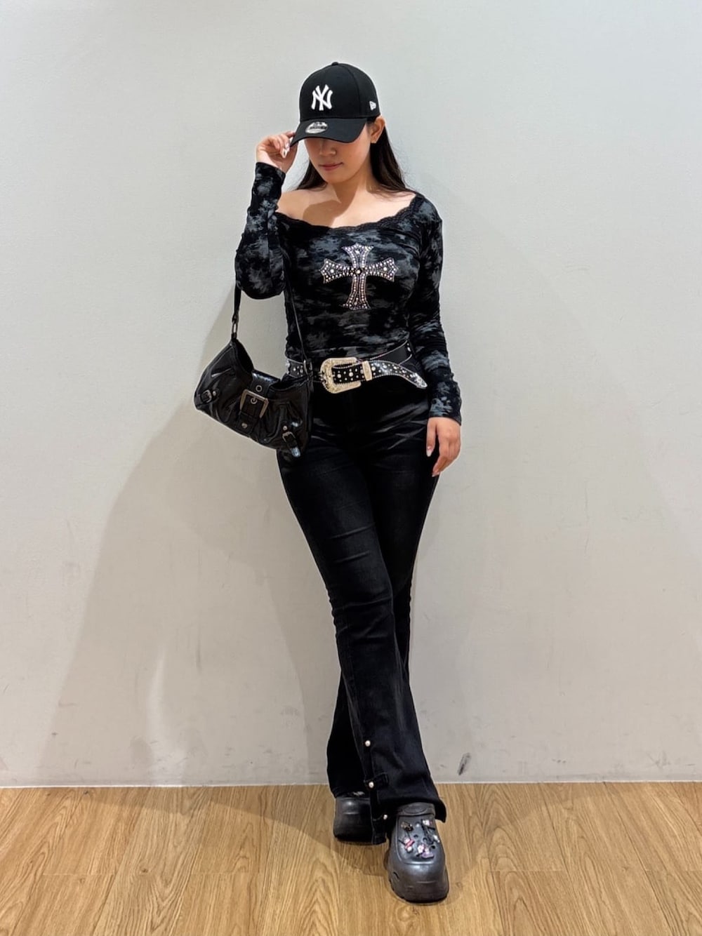 ベルトもキラキラで十字架がついてるものと合わせました†❤︎ オールブラックコーデは全身がしまって細見えするのでぜひ試してみてください💄🫶