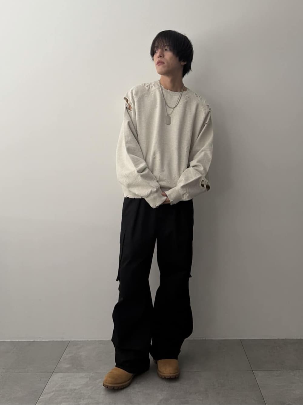 ダメージデザインのスウェットが1枚で可愛い! トレンドのコンパクトなシルエットに身幅はしっかりあるのでどんな服装ともマッチ!