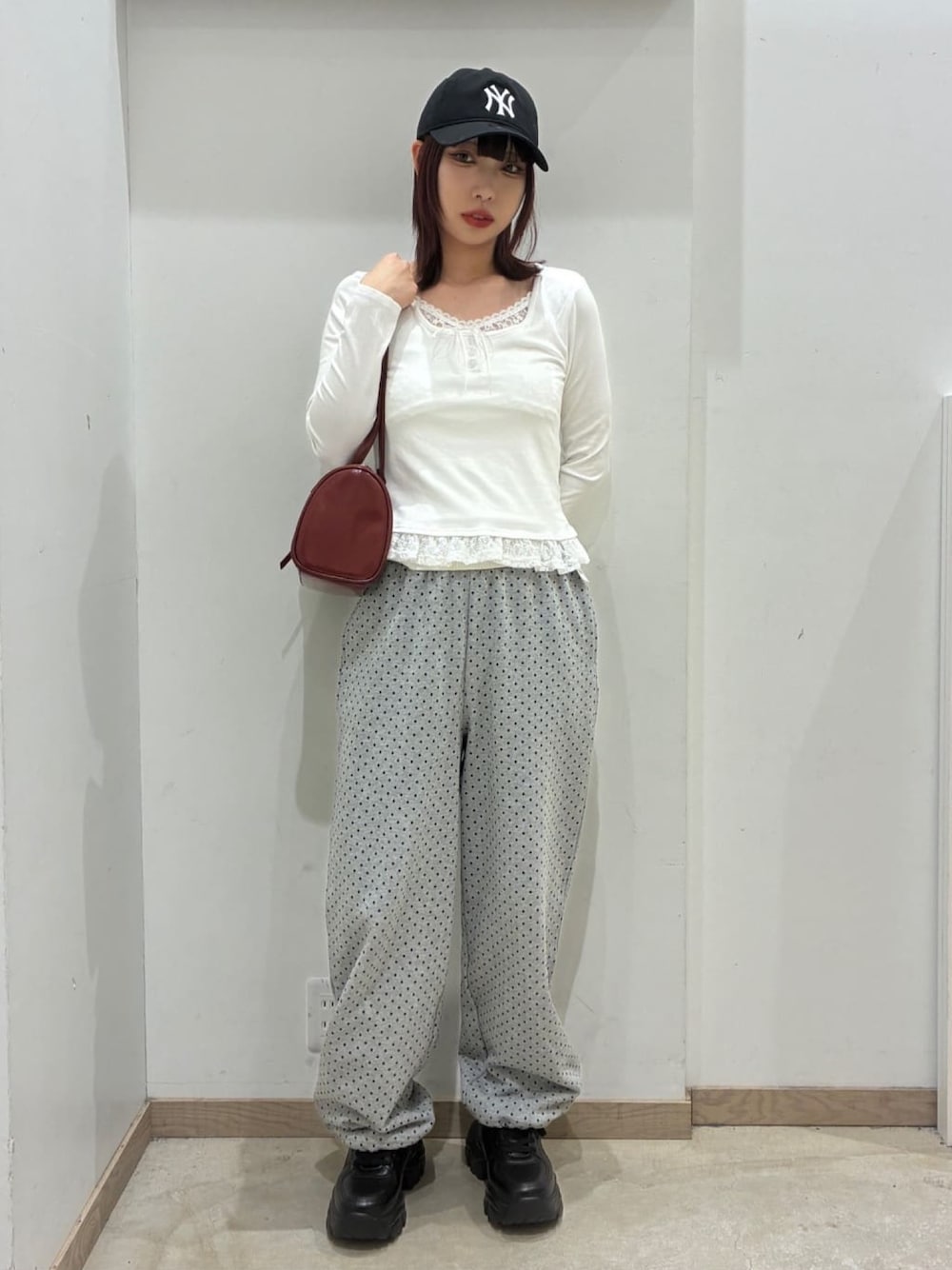 トレンドのドット柄を取り入れた韓国ストリートコーデ!!春を意識したロンTは、レースの部分がくっついているデザインになっているのでコーデの主役になる!スウェットパンツのドット柄は、主張しない細めの柄なので意外と着回しが効くアイテム⭕️