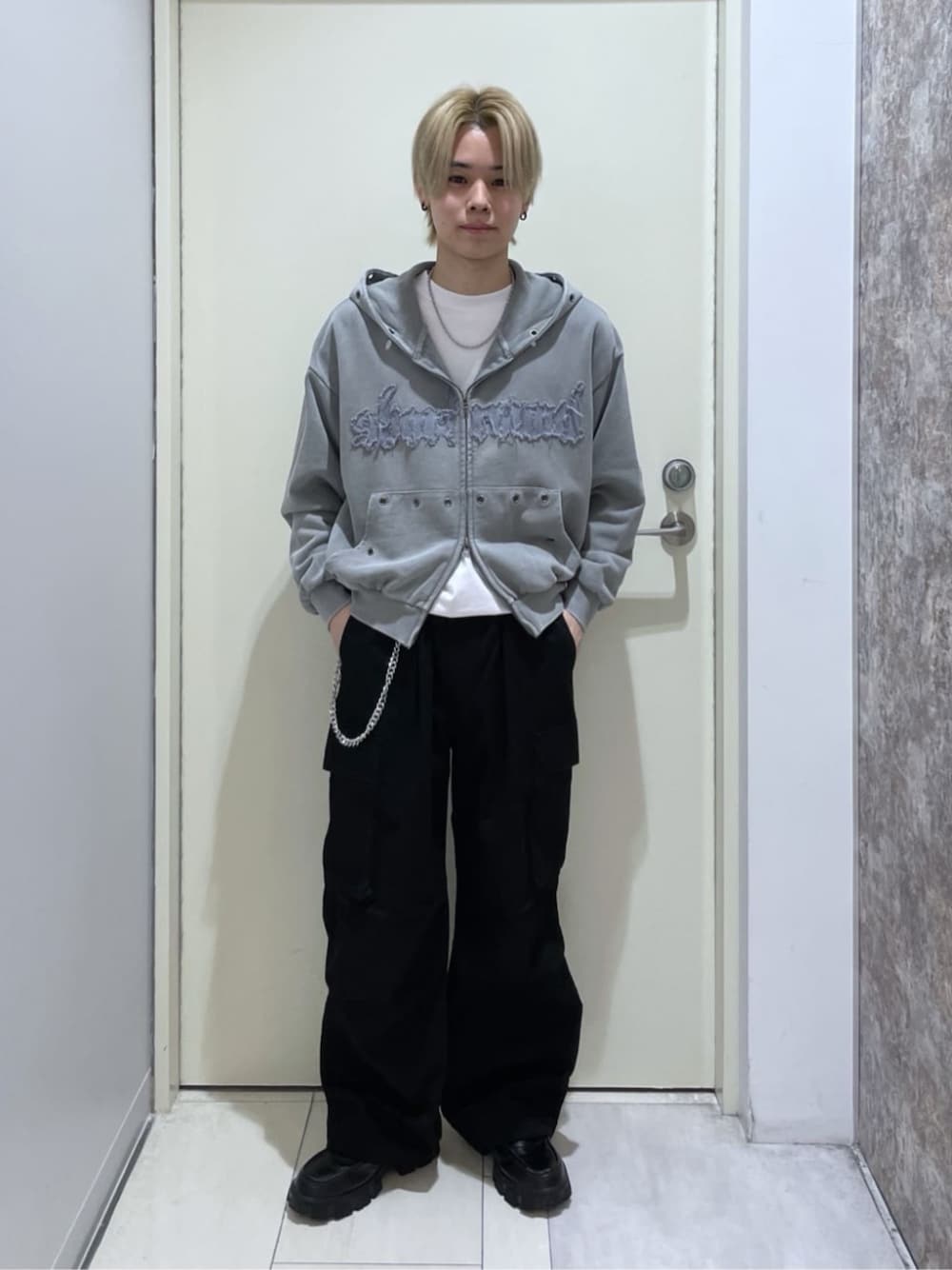 ブリーチハトメZIPパーカーとイージーワイドカーゴパンツを合わせたコーデです!! ハトメデザインが特徴のパーカー!! 前面のグラフィックが目立つので1枚でもかっこよく着こなせて、ダブルZIPを活かした開放感のあるすたいりんぐができます!! カーゴパンツと合わせてストリート系統にしてみました!!