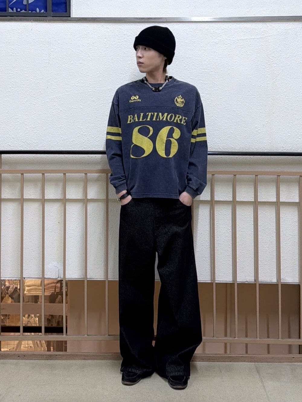 ナンバリングロンTとエクストラバギーパンツを使った春のストリートコーデ! ナンバリングロンTは少し色落ちたような加工がされていてストリートコーデにとても合います✨️ エクストラバギーパンツは今流行りのオーバーシルエットでダボッと着ることができます✨️